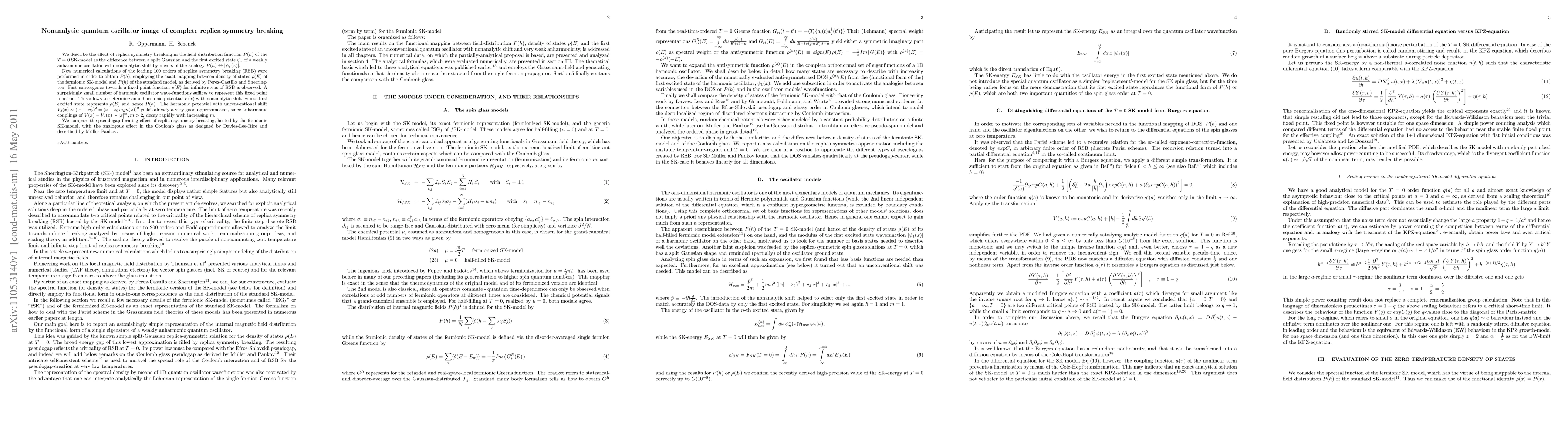We describe the effect of replica symmetry breaking in the field distribution function P(h) of the T=0 SK-model as the difference between a split Gaussian and the first excited state $\psi_1$ of a weakly anharmonic oscillator with nonanalytic shift by means of the analogy $P(h)<->|\psi_1(x)|$. New numerical calculations of the leading 100 orders of replica symmetry breaking (RSB) were performed in order to obtain P(h), employing the exact mapping between density of states $\rho(E)$ of the fermionic SK-model and P(h) of the standard model, as derived by Perez-Castillo and Sherrington. Fast convergence towards a fixed point function $\rho(E)$ for infinite steps of RSB is observed. A surprisingly small number of harmonic oscillator wave-functions suffices to represent this fixed point function. This allows to determine an anharmonic potential V(x) with nonanalytic shift, whose first excited state represents $\rho(E)$ and hence P(h). The harmonic potential with unconventional shift $V_2(x)\sim (|x|-x_0)^2=(x-x_0\,sign(x))^2$ yields already a very good approximation, since anharmonic couplings of $V(x)-V_2(x)\sim |x|^{m}, m>2,$ decay rapidly with increasing m. We compare the pseudogap-forming effect of replica symmetry breaking, hosted by the fermionic SK-model, with the analogous effect in the Coulomb glass as designed by Davies-Lee-Rice and described by M\"uller-Pankov.