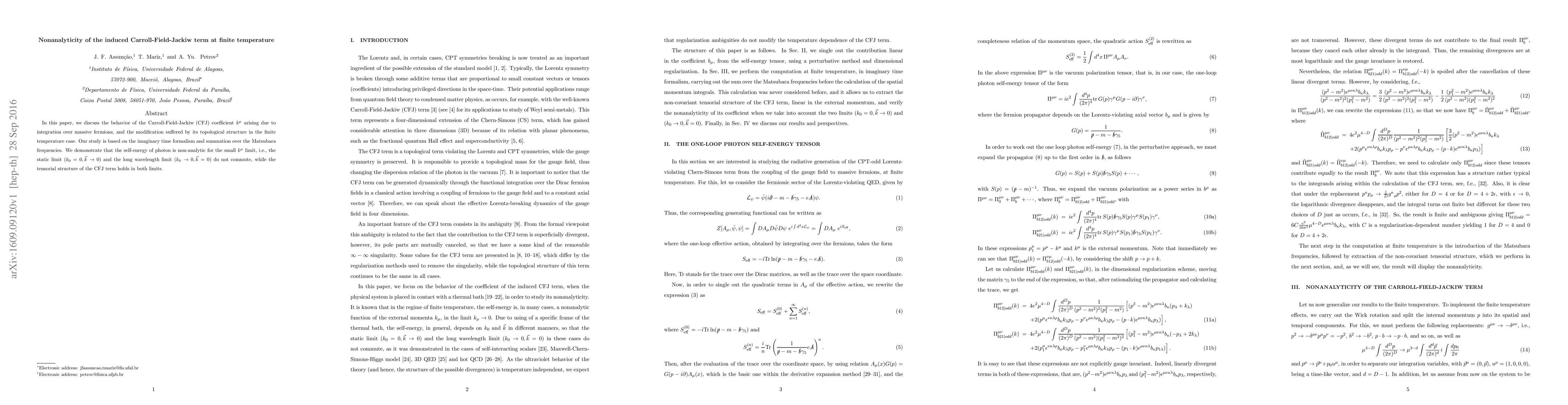 In this paper, we discuss the behavior of the Carroll-Field-Jackiw (CFJ) coefficient $k^{\mu}$ arising due to integration over massive fermions, and the modification suffered by its topological structure in the finite temperature case. Our study is based on the imaginary time formalism and summation over the Matsubara frequencies. We demonstrate that the self-energy of photon is non-analytic for the small $k^{\mu}$ limit, i.e., the static limit $(k_0=0,\vec k\rightarrow 0)$ and the long wavelength limit $(k_0\rightarrow 0,\vec k= 0)$ do not commute, while the tensorial structure of the CFJ term holds in both limits.