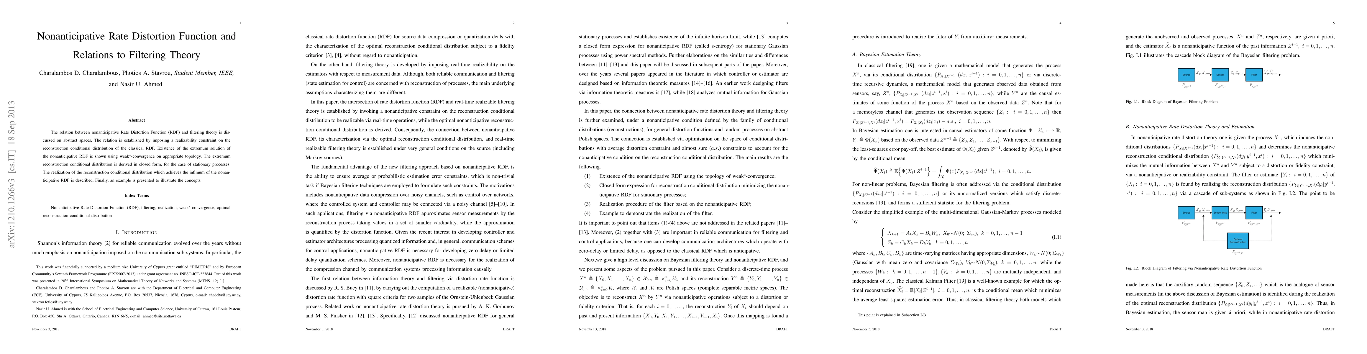 The relation between nonanticipative Rate Distortion Function (RDF) and filtering theory is discussed on abstract spaces. The relation is established by imposing a realizability constraint on the reconstruction conditional distribution of the classical RDF. Existence of the extremum solution of the nonanticipative RDF is shown using weak$^*$-convergence on appropriate topology. The extremum reconstruction conditional distribution is derived in closed form, for the case of stationary processes. The realization of the reconstruction conditional distribution which achieves the infimum of the nonanticipative RDF is described. Finally, an example is presented to illustrate the concepts.