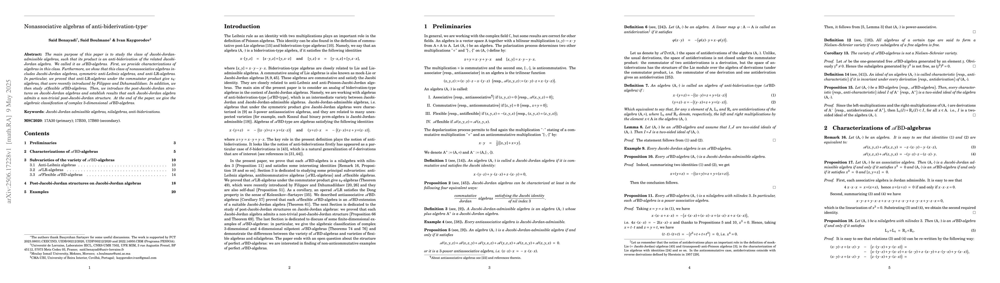 The main purpose of this paper is to study the class of Jacobi-Jordan-admissible algebras, such that its product is an anti-biderivation of the related Jacobi-Jordan algebra. We called it as $\mathcal A{\rm BD}$-algebras. First, we provide characterizations of algebras in this class. Furthermore, we show that this class of nonassociative algebras includes Jacobi-Jordan algebras, symmetric anti-Leibniz algebras, and anti-${\rm LR}$-algebras. In particular, we proved that anti-${\rm LR}$-algebras under the commutator product give $\mathfrak{s}_4$-algebras, which were recently introduced by Filippov and Dzhumadildaev. In addition, we then study $\mathcal A$flexible ${\mathcal A}{\rm BD}$-algebras. Then, we introduce the post-Jacobi-Jordan structures on Jacobi-Jordan algebras and establish results that each Jacobi-Jordan algebra admits a non-trivial post-Jacobi-Jordan structure. At the end of the paper, we give the algebraic classification of complex $3$-dimensional $\mathcal A{\rm BD}$-algebras.