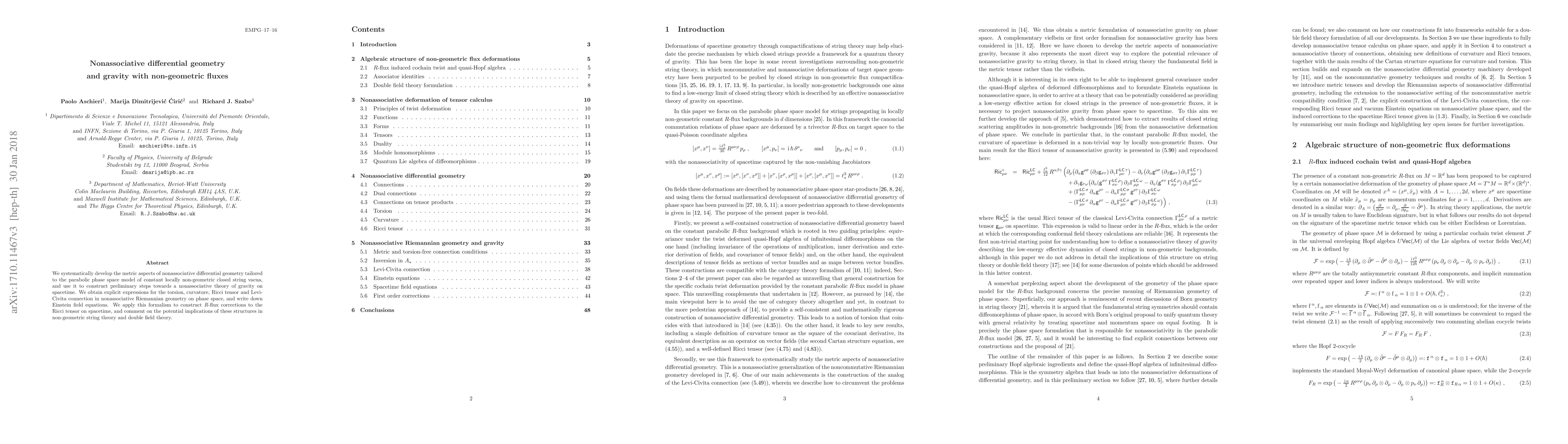 This paper develops nonassociative differential geometry for constant locally non-geometric closed string vacua, constructing a preliminary nonassociative theory of gravity with explicit expressions for torsion, curvature, and the Ricci tensor. It also explores R-flux corrections and their implications for non-geometric string theory and double field theory.