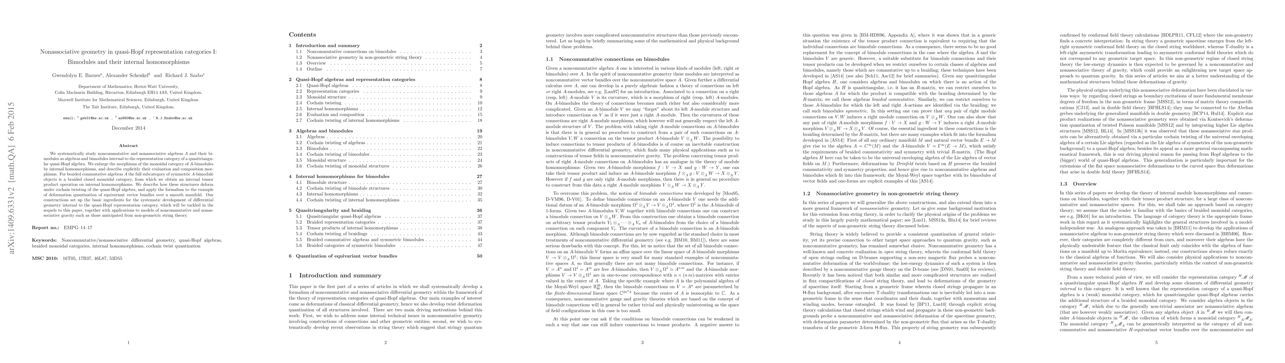 We systematically study noncommutative and nonassociative algebras A and their bimodules as algebras and bimodules internal to the representation category of a quasitriangular quasi-Hopf algebra. We enlarge the morphisms of the monoidal category of A-bimodules by internal homomorphisms, and describe explicitly their evaluation and composition morphisms. For braided commutative algebras A the full subcategory of symmetric A-bimodule objects is a braided closed monoidal category, from which we obtain an internal tensor product operation on internal homomorphisms. We describe how these structures deform under cochain twisting of the quasi-Hopf algebra, and apply the formalism to the example of deformation quantization of equivariant vector bundles over a smooth manifold. Our constructions set up the basic ingredients for the systematic development of differential geometry internal to the quasi-Hopf representation category, which will be tackled in the sequels to this paper, together with applications to models of noncommutative and nonassociative gravity such as those anticipated from non-geometric string theory.