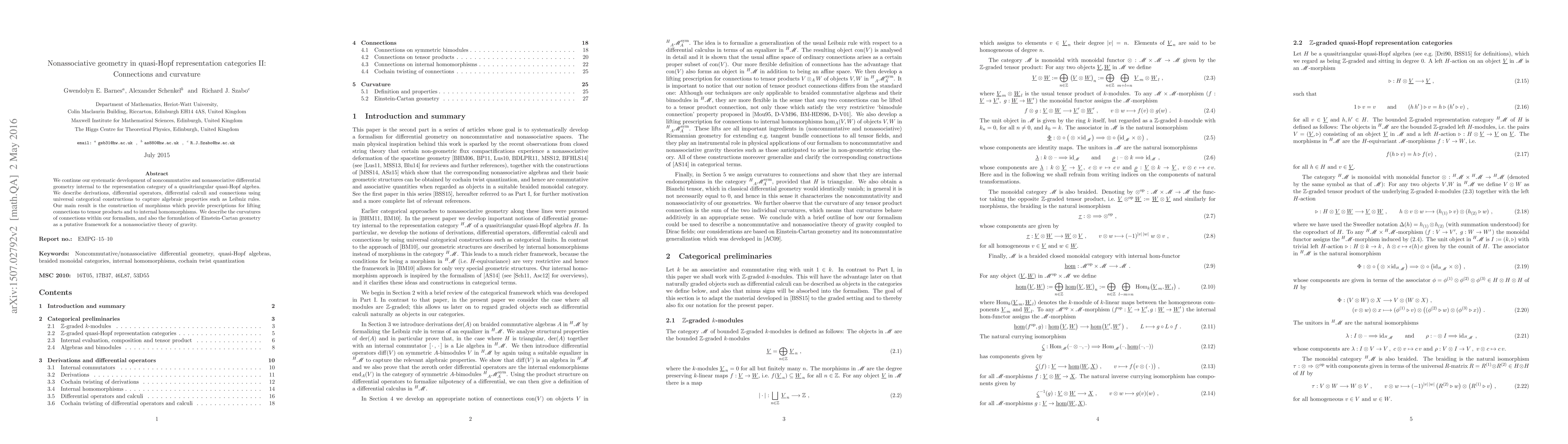 We continue our systematic development of noncommutative and nonassociative differential geometry internal to the representation category of a quasitriangular quasi-Hopf algebra. We describe derivations, differential operators, differential calculi and connections using universal categorical constructions to capture algebraic properties such as Leibniz rules. Our main result is the construction of morphisms which provide prescriptions for lifting connections to tensor products and to internal homomorphisms. We describe the curvatures of connections within our formalism, and also the formulation of Einstein-Cartan geometry as a putative framework for a nonassociative theory of gravity.