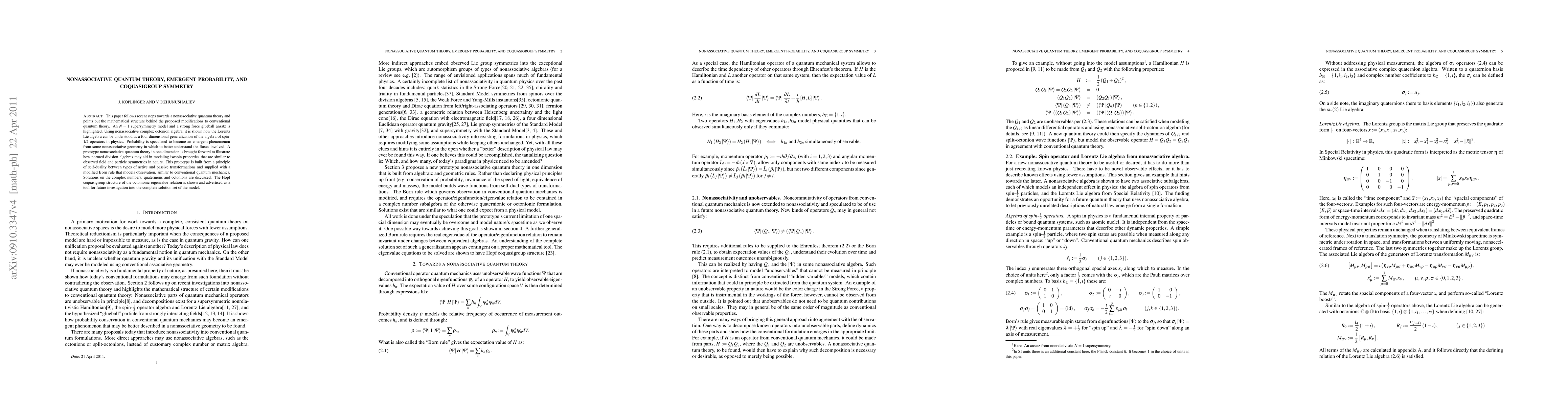 This paper follows recent steps towards a nonassociative quantum theory and points out the mathematical structure behind the proposed modifications to conventional quantum theory. An N=1 supersymmetry model and a strong force glueball ansatz is highlighted. Using nonassociative complex octonion algebra, it is shown how the Lorentz Lie algebra can be understood as a four dimensional generalization of the algebra of spin-1/2 operators in physics. Probability is speculated to become an emergent phenomenon from some nonassociative geometry in which to better understand the fluxes involved. A prototype nonassociative quantum theory in one dimension is brought forward to illustrate how normed division algebras may aid in modeling isospin properties that are similar to observed field and particle symmetries in nature. This prototype is built from a principle of self-duality between types of active and passive transformations and supplied with a modified Born rule that models observation, similar to conventional quantum mechanics. Solutions on the complex numbers, quaternions and octonions are discussed. The Hopf coquasigroup structure of the octonionic eigenvalue relation is shown and advertised as a tool for future investigation into the complete solution set of the model.