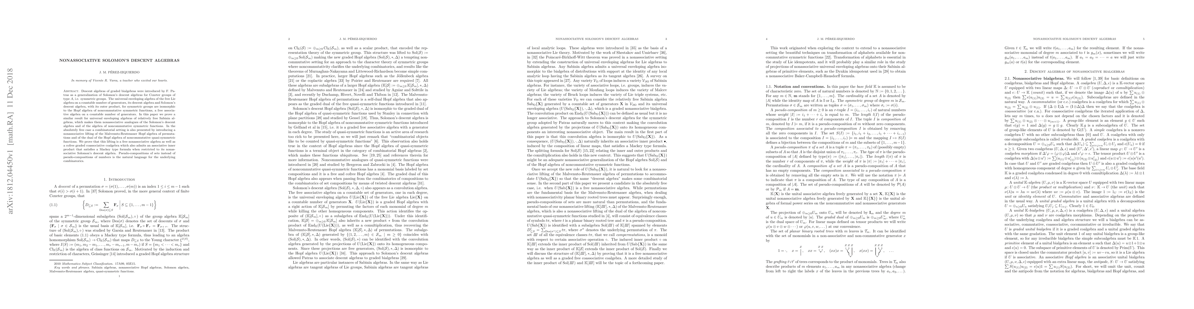 Descent algebras of graded bialgebras were introduced by F. Patras as a generalization of Solomon's descent algebras for Coxeter groups of type $A$, i.e. symmetric groups. The universal enveloping algebra of the free Lie algebra on a countable number of generators, its descent algebra and Solomon's descent algebra, with its outer product, for symmetric groups are isomorphic to the Hopf algebra of noncommutative symmetric functions, a free associative algebra on a countable number of generators. In this paper we prove a similar result for universal enveloping algebras of relatively free Sabinin algebras, which makes them nonassociative analogues of the Solomon's descent algebra and of the algebra of noncommutative symmetric functions. In the absolutely free case a combinatorial setting is also presented by introducing a nonassociative lifting of the Malvenuto-Reutenauer Hopf algebra of permutations and of the dual of the Hopf algebra of noncommutative quasi-symmetric functions. We prove that this lifting is a free nonassociative algebra as well as a cofree graded coassociative coalgebra which also admits an associative inner product that satisfies a Mackey type formula when restricted to its nonassociative Solomon's descent algebra. Pseudo-compositions of sets instead of pseudo-compositions of numbers is the natural language for the underlying combinatorics.