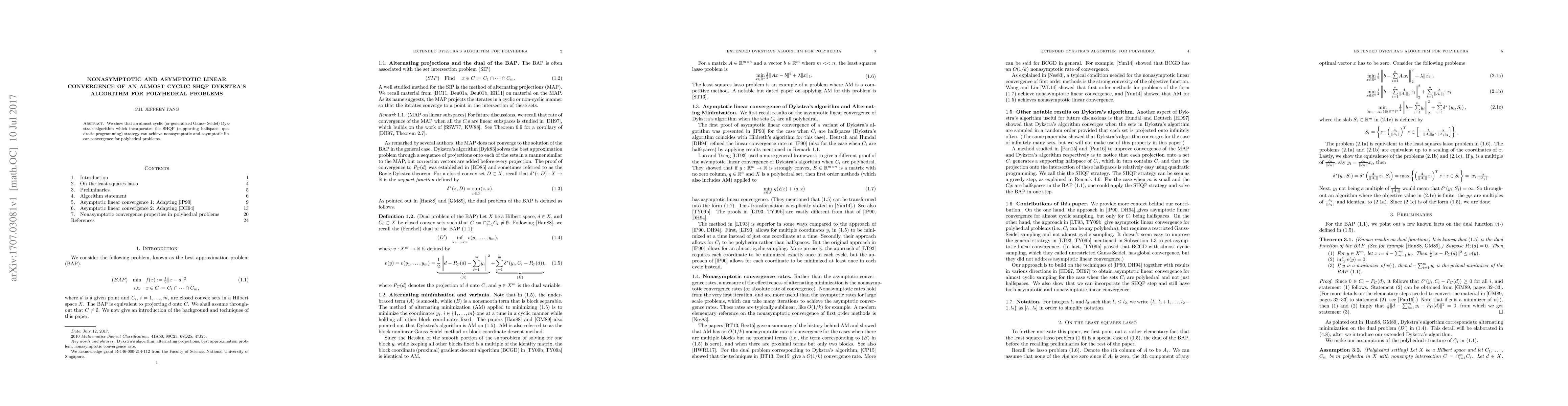 Summary: This paper demonstrates that an almost cyclic Dykstra's algorithm with SHQP strategy achieves both nonasymptotic and asymptotic linear convergence for solving polyhedral problems. The method's efficiency is highlighted through its robust convergence properties.