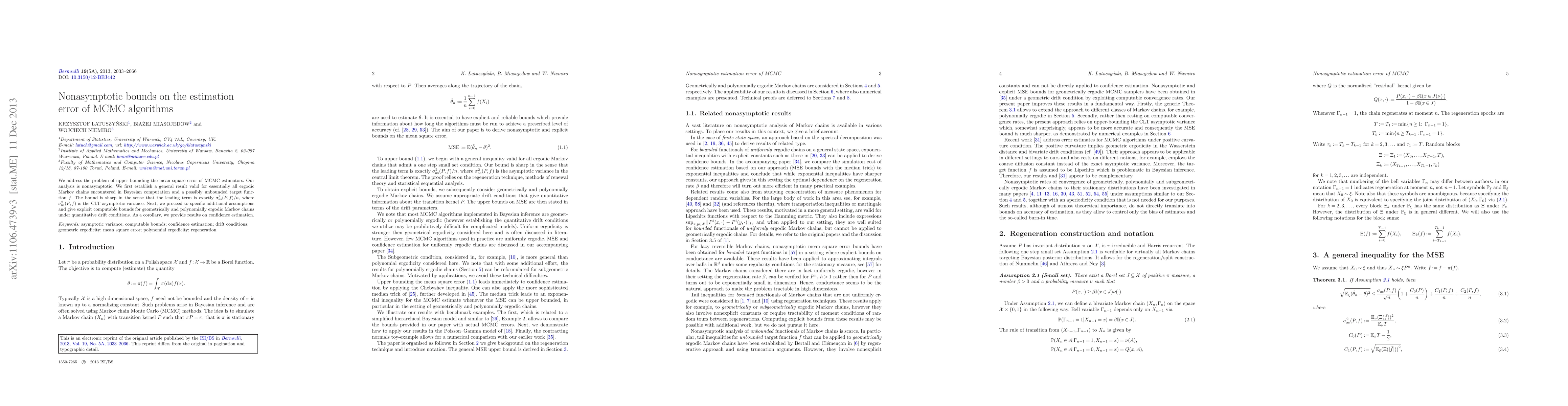 We address the problem of upper bounding the mean square error of MCMC estimators. Our analysis is nonasymptotic. We first establish a general result valid for essentially all ergodic Markov chains encountered in Bayesian computation and a possibly unbounded target function $f$. The bound is sharp in the sense that the leading term is exactly $\sigma_{\mathrm {as}}^2(P,f)/n$, where $\sigma_{\mathrm{as}}^2(P,f)$ is the CLT asymptotic variance. Next, we proceed to specific additional assumptions and give explicit computable bounds for geometrically and polynomially ergodic Markov chains under quantitative drift conditions. As a corollary, we provide results on confidence estimation.