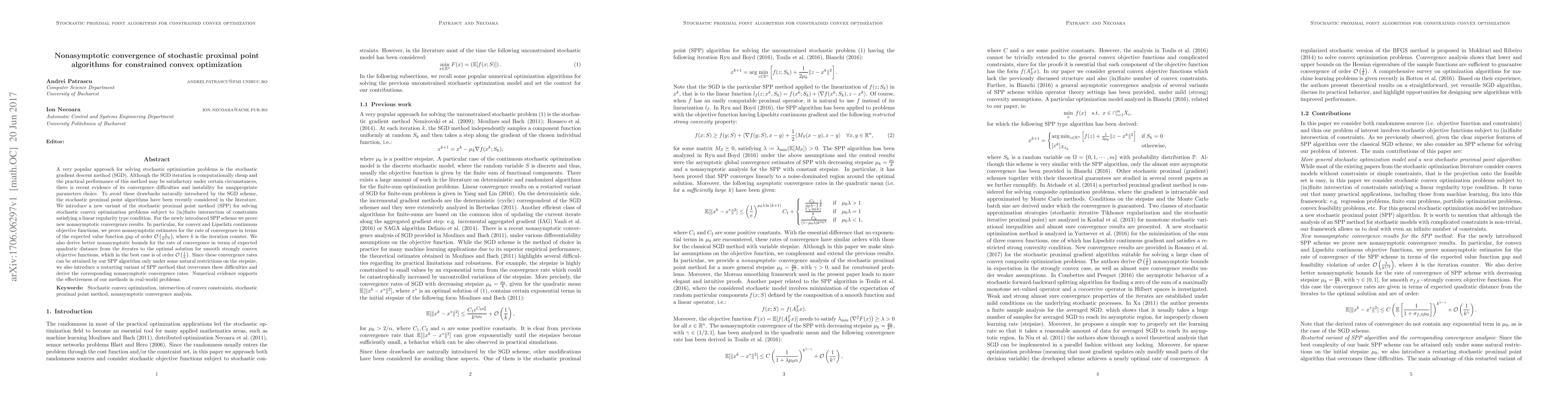 This paper introduces a new variant of the stochastic proximal point algorithm (SPP) for solving stochastic convex optimization problems with constraints. It proves nonasymptotic convergence rates, showing $\mathcal{O}(1/k^{1/2})$ for general convex functions and $\mathcal{O}(1/k)$ for smooth strongly convex functions, and proposes a restarting variant to improve convergence under appropriate stepsize conditions.