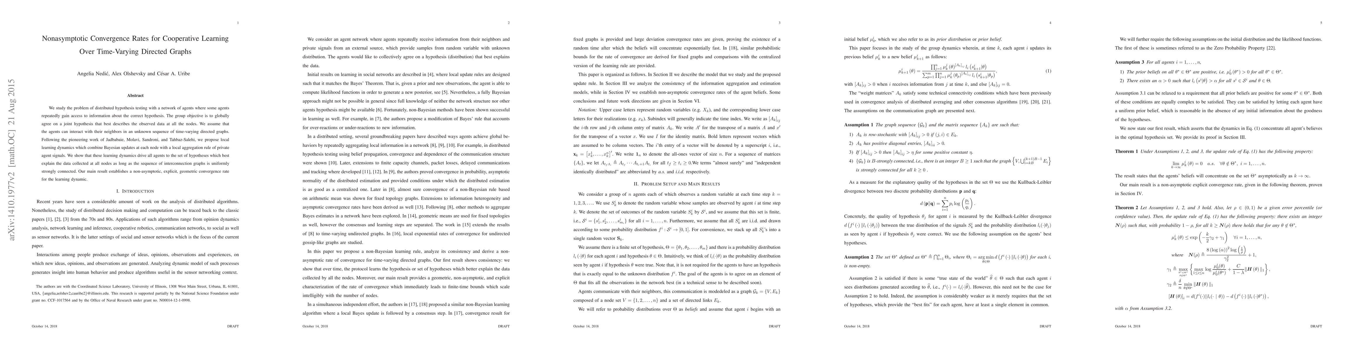 We study the problem of distributed hypothesis testing with a network of agents where some agents repeatedly gain access to information about the correct hypothesis. The group objective is to globally agree on a joint hypothesis that best describes the observed data at all the nodes. We assume that the agents can interact with their neighbors in an unknown sequence of time-varying directed graphs. Following the pioneering work of Jadbabaie, Molavi, Sandroni, and Tahbaz-Salehi, we propose local learning dynamics which combine Bayesian updates at each node with a local aggregation rule of private agent signals. We show that these learning dynamics drive all agents to the set of hypotheses which best explain the data collected at all nodes as long as the sequence of interconnection graphs is uniformly strongly connected. Our main result establishes a non-asymptotic, explicit, geometric convergence rate for the learning dynamic.
