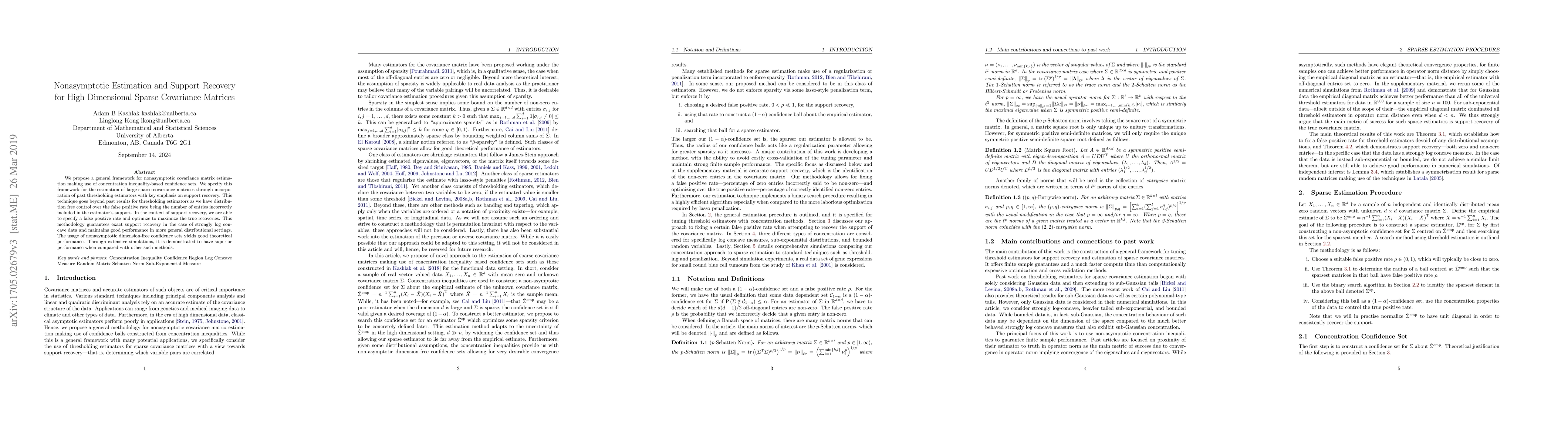 We propose a general framework for nonasymptotic covariance matrix estimation making use of concentration inequality-based confidence sets. We specify this framework for the estimation of large sparse covariance matrices through incorporation of past thresholding estimators with key emphasis on support recovery. This technique goes beyond past results for thresholding estimators by allowing for a wide range of distributional assumptions beyond merely sub-Gaussian tails. This methodology can furthermore be adapted to a wide range of other estimators and settings. The usage of nonasymptotic dimension-free confidence sets yields good theoretical performance. Through extensive simulations, it is demonstrated to have superior performance when compared with other such methods. In the context of support recovery, we are able to specify a false positive rate and optimize to maximize the true recoveries.