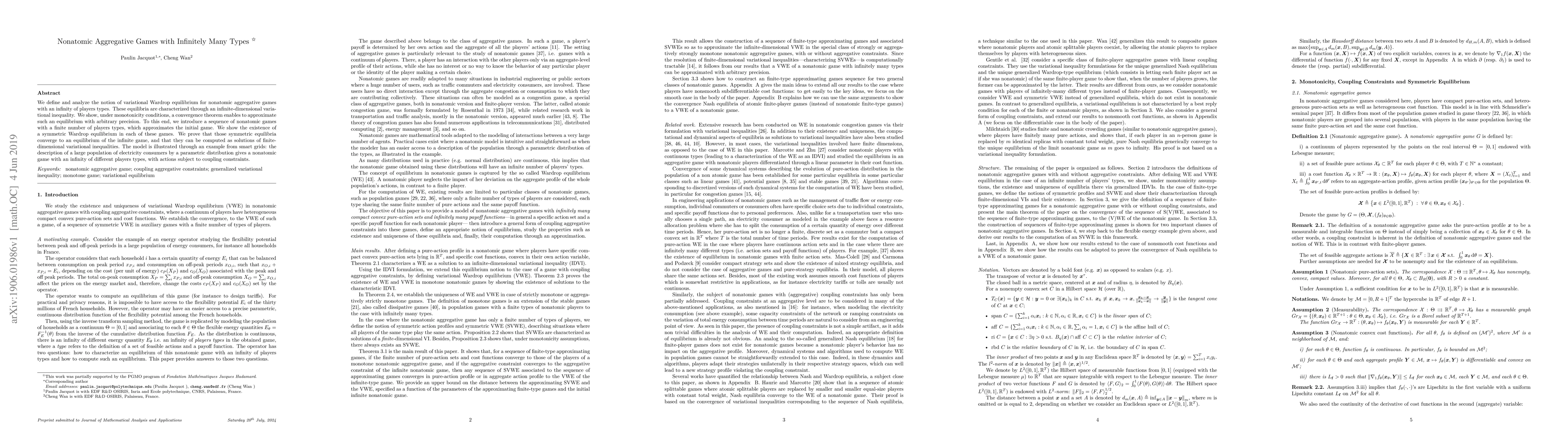 We define and analyze the notion of variational Wardrop equilibrium for nonatomic aggregative games with an infinity of players types. These equilibria are characterized through an infinite-dimensional variational inequality. We show, under monotonicity conditions, a convergence theorem enables to approximate such an equilibrium with arbitrary precision. To this end, we introduce a sequence of nonatomic games with a finite number of players types, which approximates the initial game. We show the existence of a symmetric Wardrop equilibrium in each of these games. We prove that those symmetric equilibria converge to an equilibrium of the infinite game, and that they can be computed as solutions of finite-dimensional variational inequalities. The model is illustrated through an example from smart grids: the description of a large population of electricity consumers by a parametric distribution gives a nonatomic game with an infinity of different players types, with actions subject to coupling constraints.
