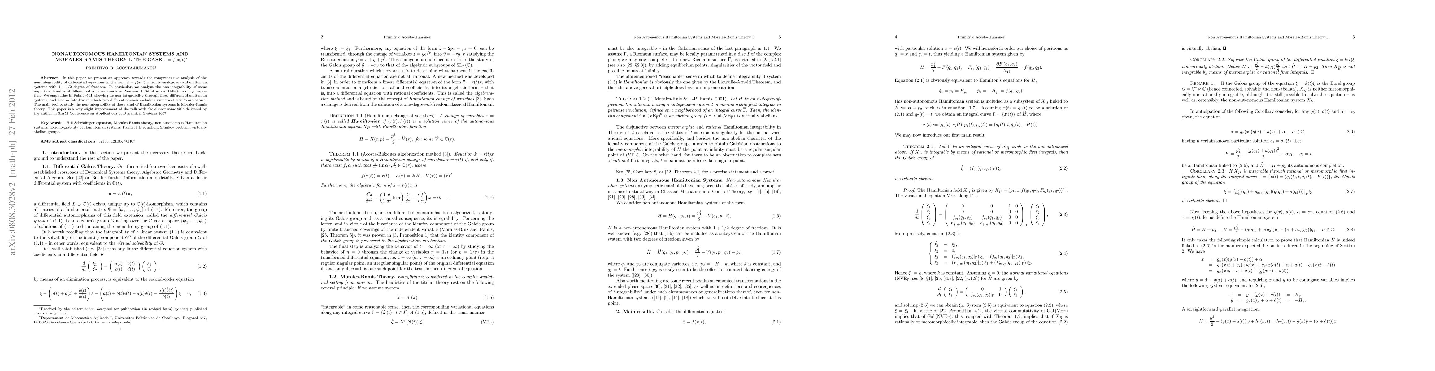 In this paper we present an approach towards the comprehensive analysis of the non-integrability of differential equations in the form $\ddot x=f(x,t)$ which is analogous to Hamiltonian systems with 1+1/2 degree of freedom. In particular, we analyze the non-integrability of some important families of differential equations such as Painlev\'e II, Sitnikov and Hill-Schr\"odinger equation. We emphasize in Painlev\'e II, showing its non-integrability through three different Hamiltonian systems, and also in Sitnikov in which two different version including numerical results are shown. The main tool to study the non-integrability of these kind of Hamiltonian systems is Morales-Ramis theory. This paper is a very slight improvement of the talk with the almost-same title delivered by the author in SIAM Conference on Applications of Dynamical Systems 2007.