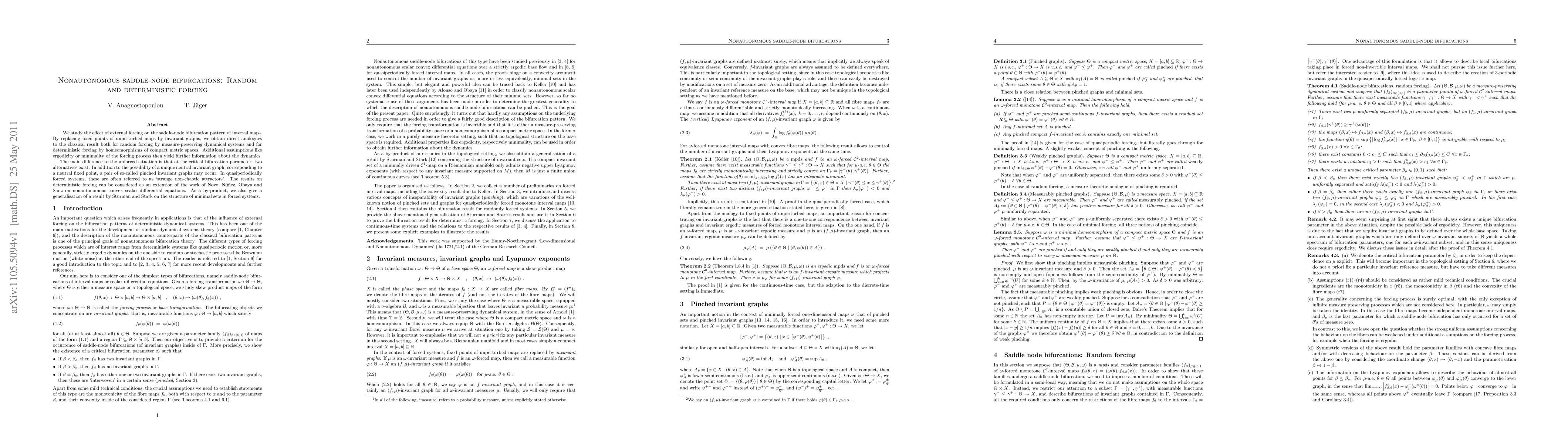 We study the effect of external forcing on the saddle-node bifurcation pattern of interval maps. By replacing fixed points of unperturbed maps by invariant graphs, we obtain direct analogues to the classical result both for random forcing by measure-preserving dynamical systems and for deterministic forcing by homeomorphisms of compact metric spaces. Additional assumptions like ergodicity or minimality of the forcing process then yield further information about the dynamics. The main difference to the unforced situation is that at the critical bifurcation parameter, two alternatives exist. In addition to the possibility of a unique neutral invariant graph, corresponding to a neutral fixed point, a pair of so-called pinched invariant graphs may occur. In quasiperiodically forced systems, these are often referred to as 'strange non-chaotic attractors'. The results on deterministic forcing can be considered as an extension of the work of Novo, Nunez, Obaya and Sanz on nonautonomous convex scalar differential equations. As a by-product, we also give a generalisation of a result by Sturman and Stark on the structure of minimal sets in forced systems.
