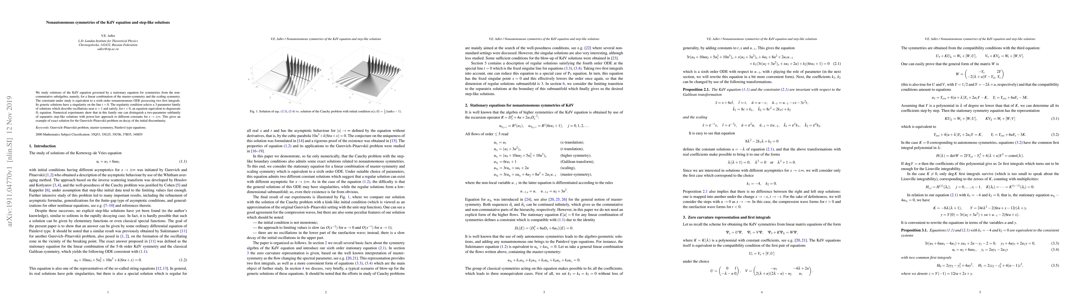 We study solutions of the KdV equation governed by a stationary equation for symmetries from the non-commutative subalgebra, namely, for a linear combination of the master-symmetry and the scaling symmetry. The constraint under study is equivalent to a sixth order nonautonomous ODE possessing two first integrals. Its generic solutions have a singularity on the line $t=0$. The regularity condition selects a 3-parameter family of solutions which describe oscillations near $u=1$ and satisfy, for $t=0$, an equation equivalent to degenerate $P_5$ equation. Numerical experiments show that in this family one can distinguish a two-parameter subfamily of separatrix step-like solutions with power-law approach to different constants for $x\to\pm\infty$. This gives an example of exact solution for the Gurevich--Pitaevskii problem on decay of the initial discontinuity.