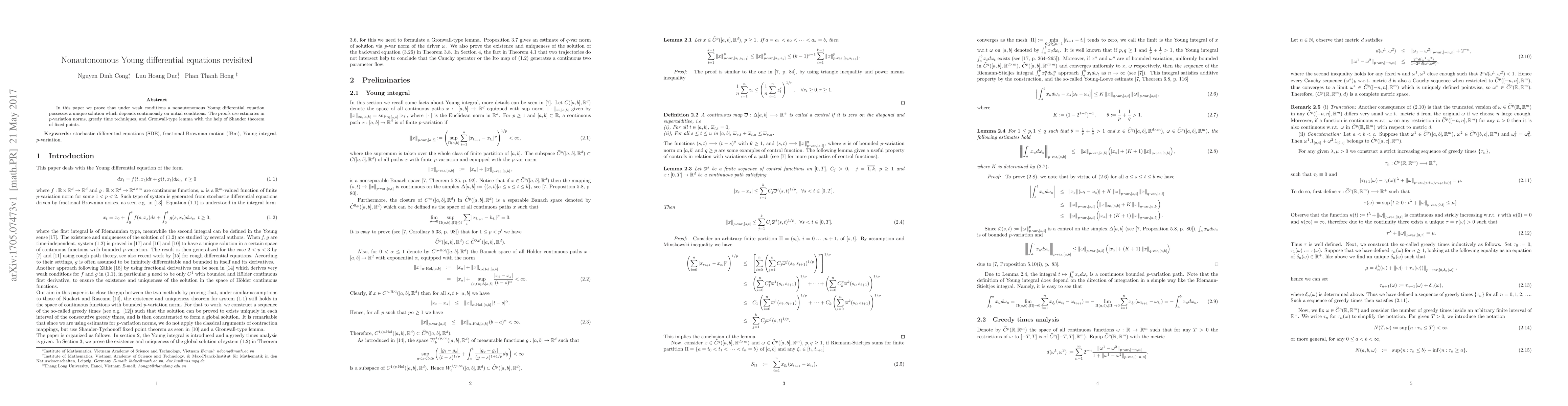 In this paper we prove that under weak conditions a nonautonomous Young differential equation possesses a unique solution which depends continuously on initial conditions. The proofs use estimates in p-variation norms, greedy time techniques, and Gronwall-type lemma with the help of Shauder theorem of fixed points.