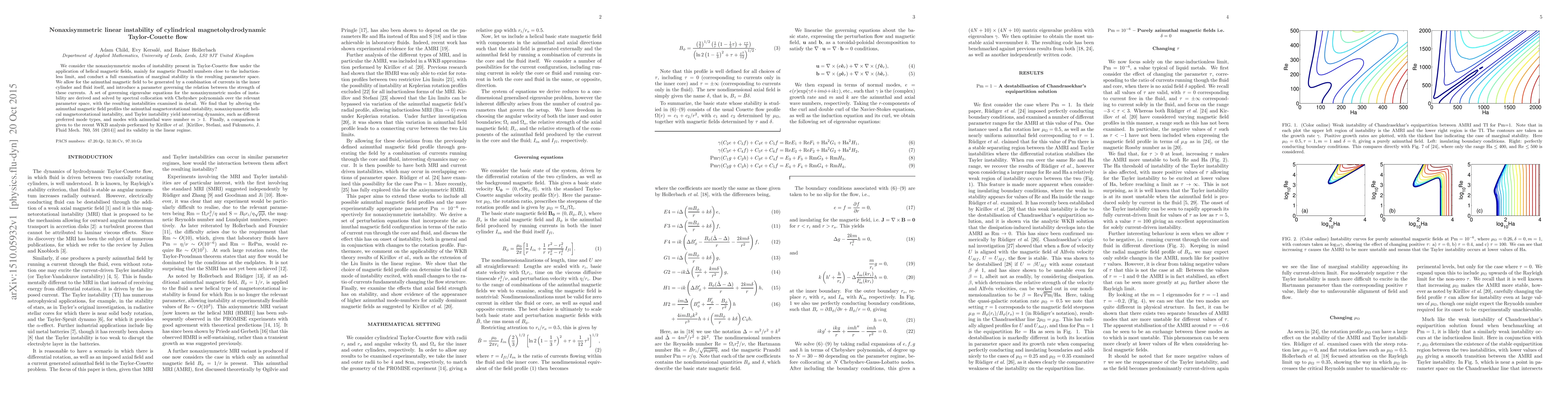 This paper investigates nonaxisymmetric instabilities in cylindrical magnetohydrodynamic Taylor-Couette flow under helical magnetic fields, with a focus on magnetic Prandtl numbers near the inductionless limit. The study derives and solves eigenvalue equations for these instabilities using spectral collocation, revealing complex dynamics and preferred mode types influenced by azimuthal magnetic field profiles.