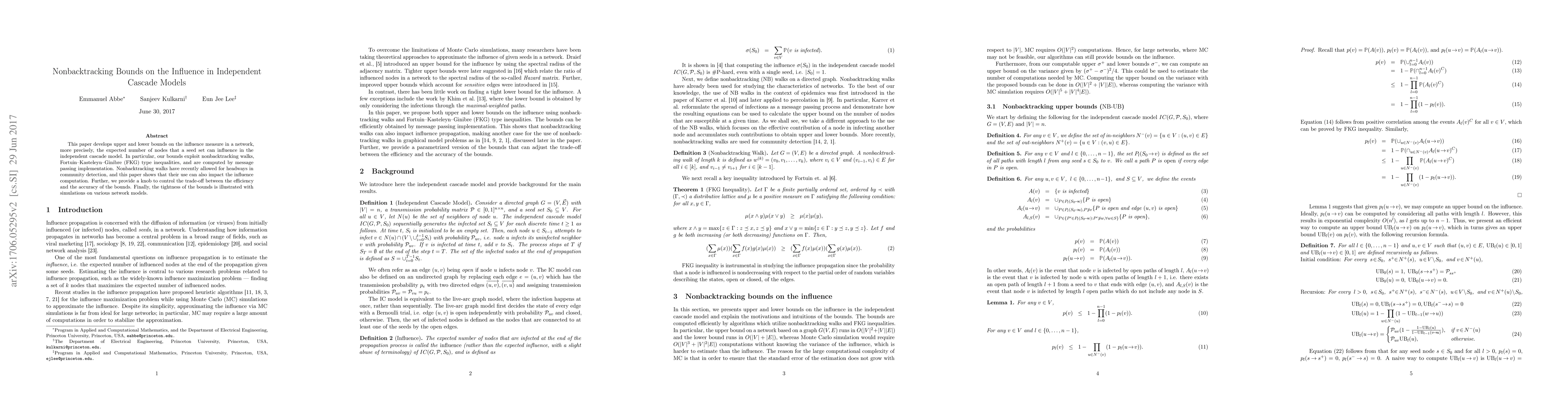 This paper develops upper and lower bounds on the influence measure in a network, more precisely, the expected number of nodes that a seed set can influence in the independent cascade model. In particular, our bounds exploit nonbacktracking walks, Fortuin-Kasteleyn-Ginibre (FKG) type inequalities, and are computed by message passing implementation. Nonbacktracking walks have recently allowed for headways in community detection, and this paper shows that their use can also impact the influence computation. Further, we provide a knob to control the trade-off between the efficiency and the accuracy of the bounds. Finally, the tightness of the bounds is illustrated with simulations on various network models.