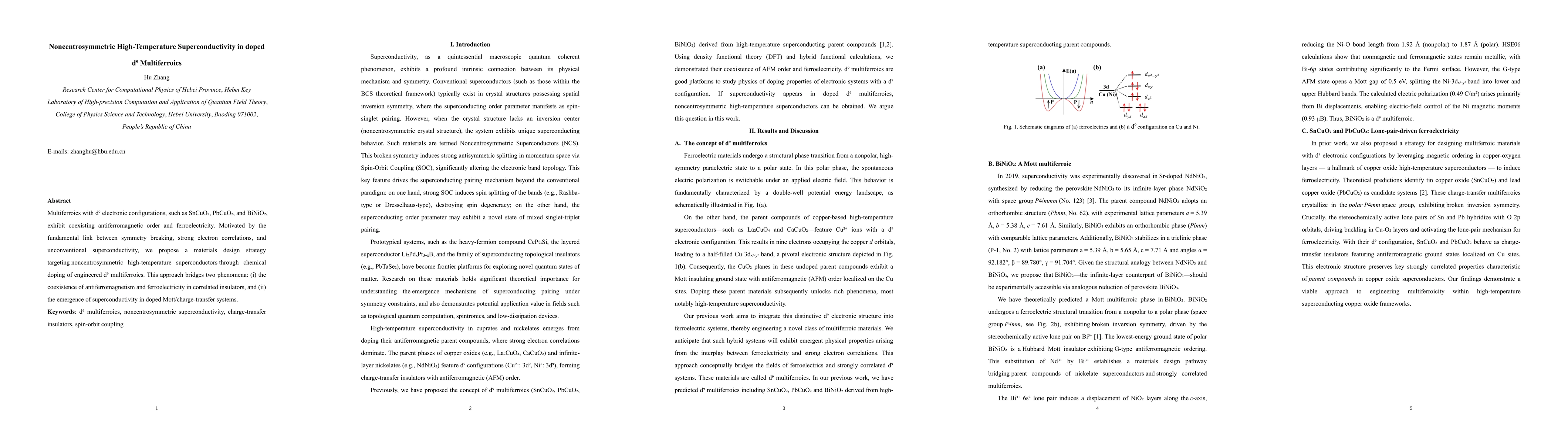 Multiferroics with $d^9$ electronic configurations, such as $SnCuO_2$, $PbCuO_2$, and $BiNiO_2$, exhibit coexisting antiferromagnetic order and ferroelectricity. Motivated by the fundamental link between symmetry breaking, strong electron correlations, and unconventional superconductivity, we propose a materials design strategy targeting noncentrosymmetric high-temperature superconductors through chemical doping of engineered $d^9$ multiferroics. This approach bridges two phenomena: (i) the coexistence of antiferromagnetism and ferroelectricity in correlated insulators, and (ii) the emergence of superconductivity in doped Mott/charge-transfer systems.