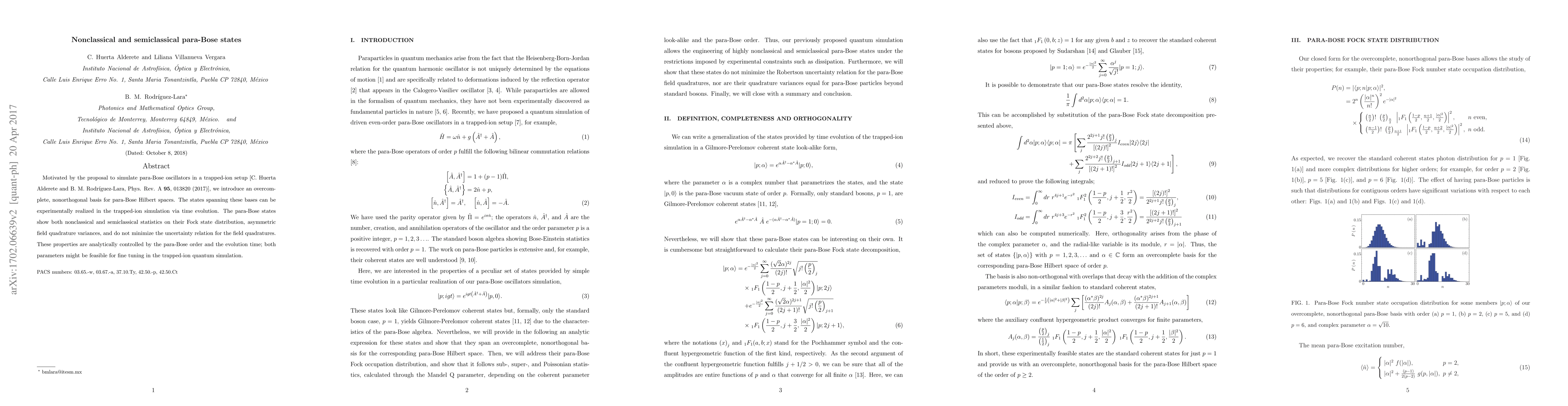 Motivated by the proposal to simulate para-Bose oscillators in a trapped-ion setup [C. Huerta Alderete and B. M. Rodr\'iguez-Lara, Phys. Rev. A 95, 013820 (2017)], we introduce an overcomplete, nonorthogonal basis for para-Bose Hilbert spaces. The states spanning these bases can be experimentally realized in the trapped-ion simulation via time evolution. The para-Bose states show both nonclassical and semiclassical statistics on their Fock state distribution, asymmetric field quadrature variances, and do not minimize the uncertainty relation for the field quadratures. These properties are analytically controlled by the para-Bose order and the evolution time; both parameters might be feasible for fine tuning in the trapped-ion quantum simulation.