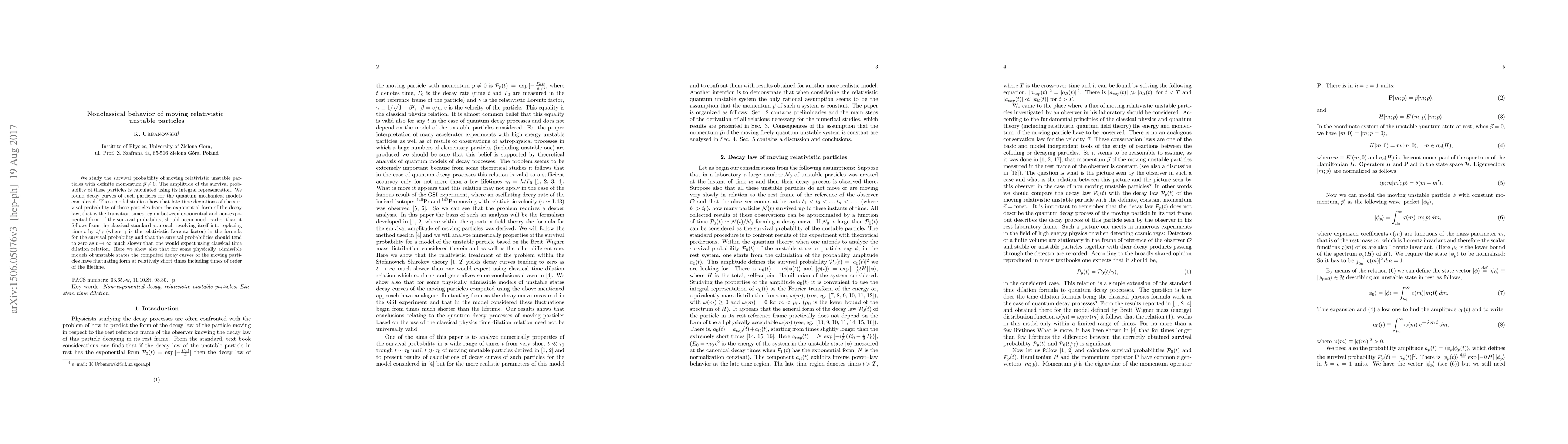 This paper investigates the survival probability of relativistic unstable particles with non-zero momentum, revealing that their decay curves exhibit nonclassical behavior, deviating from exponential decay earlier than predicted by classical time dilation. The study also shows fluctuating decay curves for certain models at short times, including times comparable to the particle's lifetime.