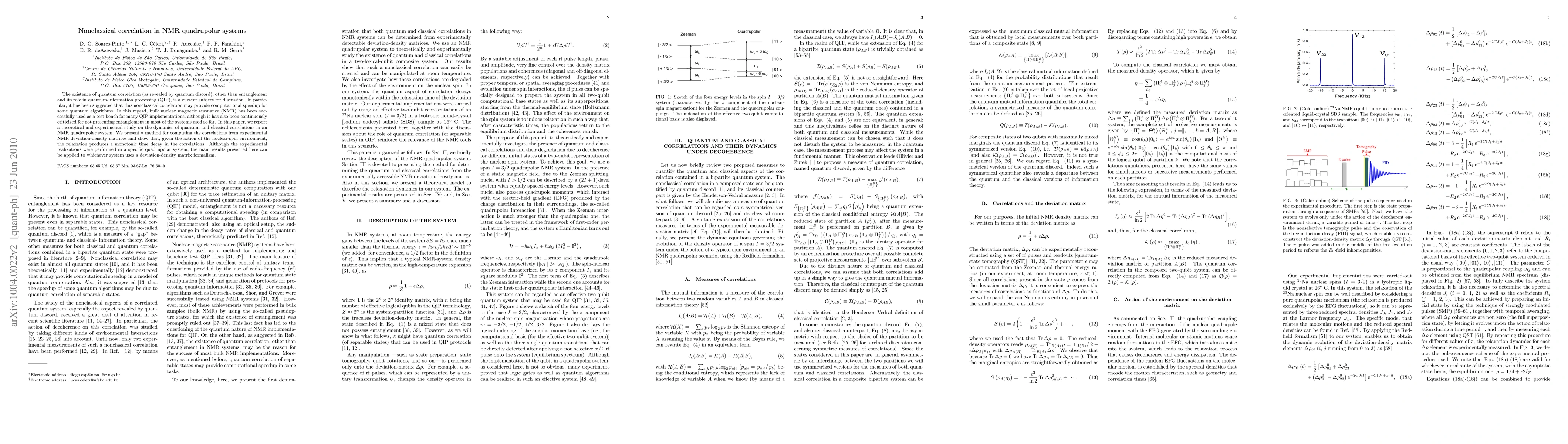 This paper investigates quantum and classical correlations in NMR quadrupolar systems, demonstrating that nonclassical correlations, beyond entanglement, can be quantified and analyzed using experimental NMR deviation-density matrices. The relaxation process in these systems leads to a monotonic decay of these correlations, highlighting their potential role in quantum-information processing.