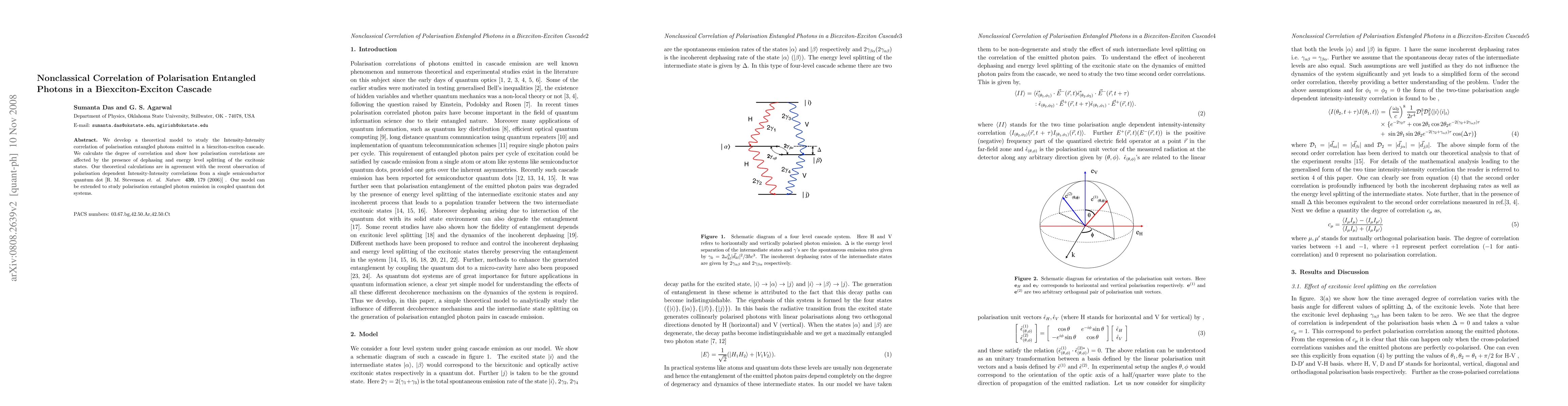 This paper develops a theoretical model to analyze the intensity-intensity correlation of polarization entangled photons in a biexciton-exciton cascade, demonstrating how dephasing and energy splitting affect polarization correlation. The model aligns with recent experimental observations of polarization-dependent correlations from semiconductor quantum dots.