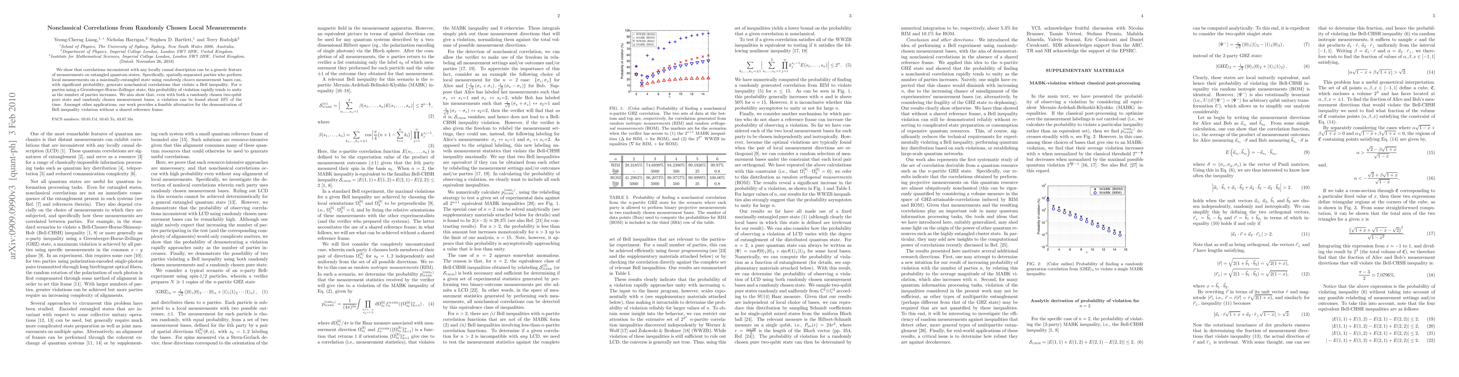 This paper demonstrates that nonclassical correlations violating Bell inequalities can emerge from randomly chosen local measurements on entangled quantum states, even without a shared reference frame. As the number of parties increases, the probability of observing such violations tends to unity, offering a practical alternative for demonstrating Bell inequality violations.