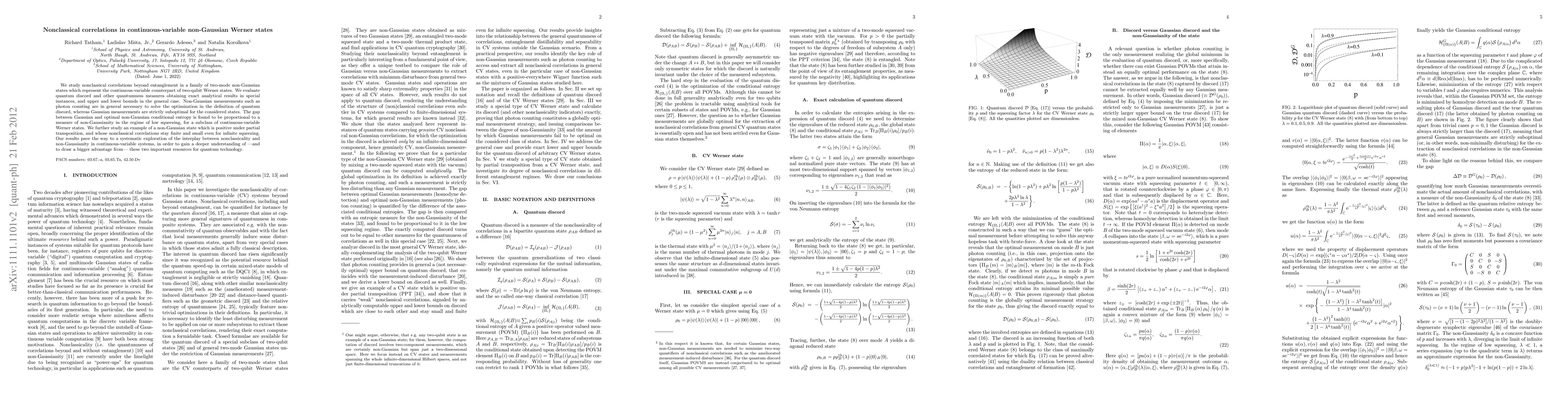 We study nonclassical correlations beyond entanglement in a family of two-mode non-Gaussian states which represent the continuous-variable counterpart of two-qubit Werner states. We evaluate quantum discord and other quantumness measures obtaining exact analytical results in special instances, and upper and lower bounds in the general case. Non-Gaussian measurements such as photon counting are in general necessary to solve the optimization in the definition of quantum discord, whereas Gaussian measurements are strictly suboptimal for the considered states. The gap between Gaussian and optimal non-Gaussian conditional entropy is found to be proportional to a measure of non-Gaussianity in the regime of low squeezing, for a subclass of continuous-variable Werner states. We further study an example of a non-Gaussian state which is positive under partial transposition, and whose nonclassical correlations stay finite and small even for infinite squeezing. Our results pave the way to a systematic exploration of the interplay between nonclassicality and non-Gaussianity in continuous-variable systems, in order to gain a deeper understanding of -and to draw a bigger advantage from- these two important resources for quantum technology.