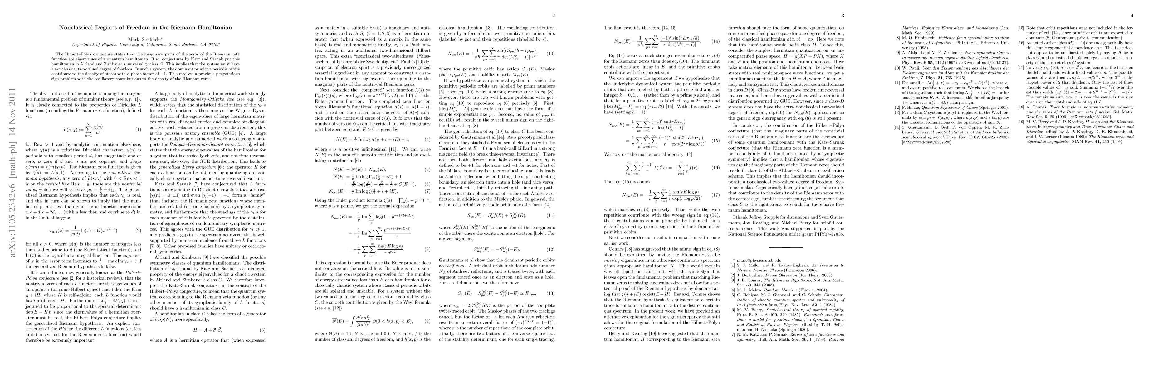The paper explores the Hilbert-Polya conjecture linking the Riemann zeta function's zeros to a quantum Hamiltonian, suggesting it belongs to a universality class with nonclassical two-valued degrees of freedom, resolving a sign problem in the density of Riemann zeros.
