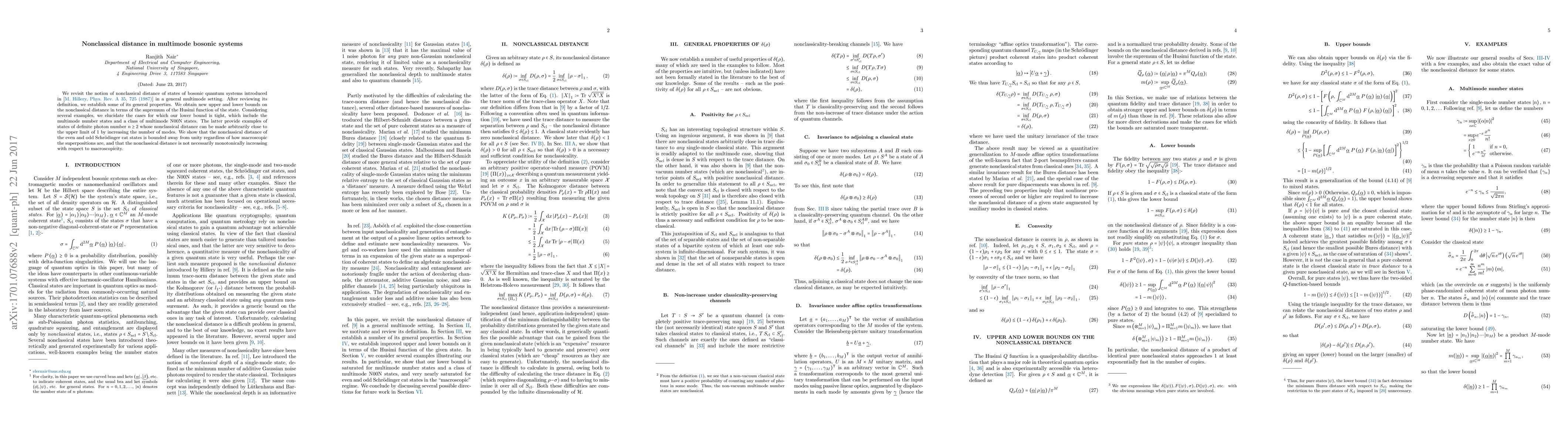 We revisit the notion of nonclassical distance of states of bosonic quantum systems introduced in [M. Hillery, Phys. Rev. A 35, 725 (1987)] in a general multimode setting. After reviewing its definition, we establish some of its general properties. We obtain new upper and lower bounds on the nonclassical distance in terms of the supremum of the Husimi function of the state. Considering several examples, we elucidate the cases for which our lower bound is tight, which include the multimode number states and a class of multimode N00N states. The latter provide examples of states of definite photon number $n \geq 2$ whose nonclassical distance can be made arbitrarily close to the upper limit of $1$ by increasing the number of modes. We show that the nonclassical distance of the even and odd Schr\"odinger cat states is bounded away from unity regardless of how macroscopic the superpositions are, and that the nonclassical distance is not necessarily monotonically increasing with respect to macroscopicity.