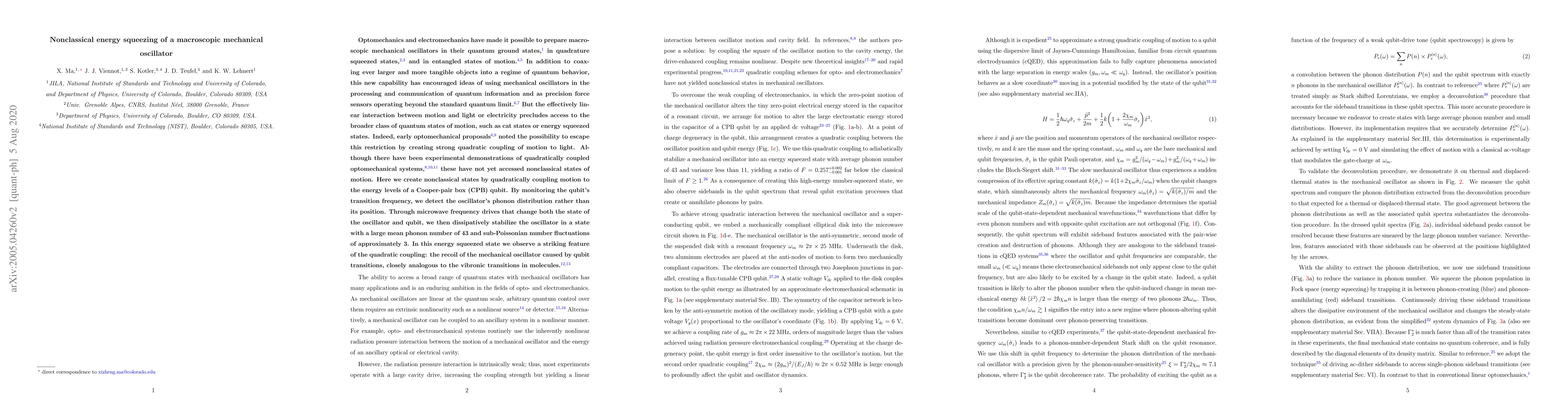 This paper demonstrates the creation of nonclassical energy squeezed states in a macroscopic mechanical oscillator by quadratically coupling it to a Cooper-pair box qubit. The study shows sub-Poissonian number fluctuations and a mean phonon number of 43, highlighting the potential for quantum information processing and precision sensing beyond classical limits.