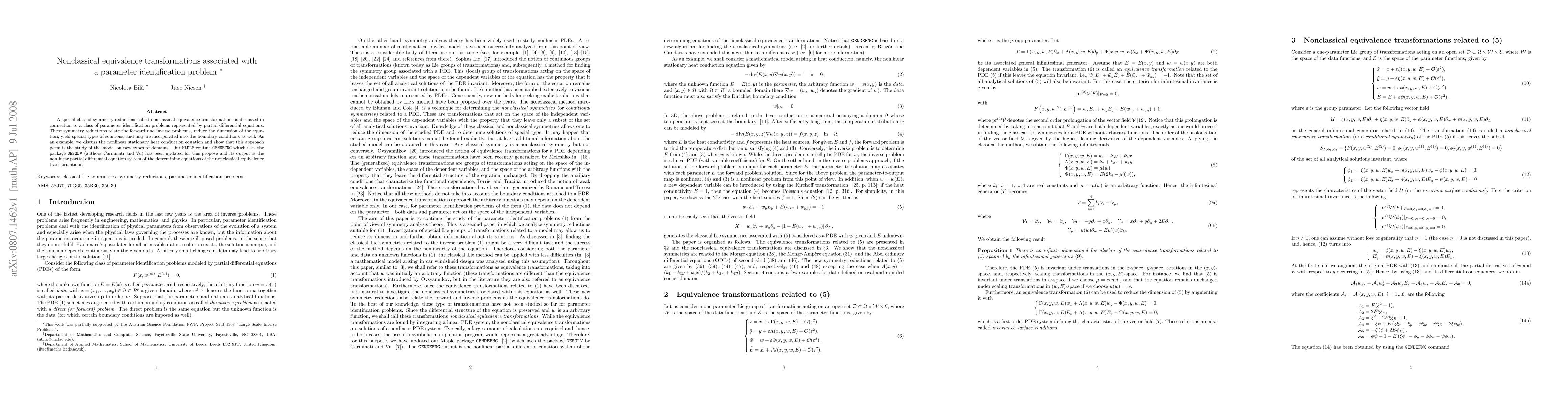 A special class of symmetry reductions called nonclassical equivalence transformations is discussed in connection to a class of parameter identification problems represented by partial differential equations. These symmetry reductions relate the forward and inverse problems, reduce the dimension of the equation, yield special types of solutions, and may be incorporated into the boundary conditions as well. As an example, we discuss the nonlinear stationary heat conduction equation and show that this approach permits the study of the model on new types of domains. Our MAPLE routine GENDEFNC which uses the package DESOLV (authors Carminati and Vu) has been updated for this propose and its output is the nonlinear partial differential equation system of the determining equations of the nonclassical equivalence transformations.