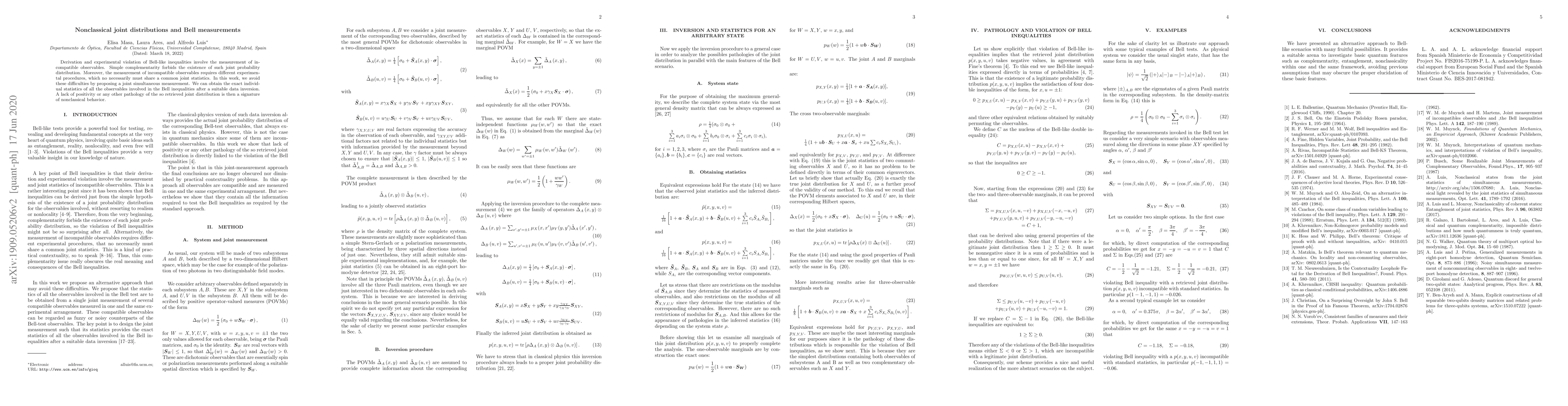The paper proposes a joint simultaneous measurement experiment to avoid difficulties in deriving and experimentally violating Bell-like inequalities, which typically involve incompatible observables. The method involves POVMs for joint measurements in two-dimensional spaces, leading to a jointly observed statistics that can be inverted to retrieve exact individual statistics of all observables.