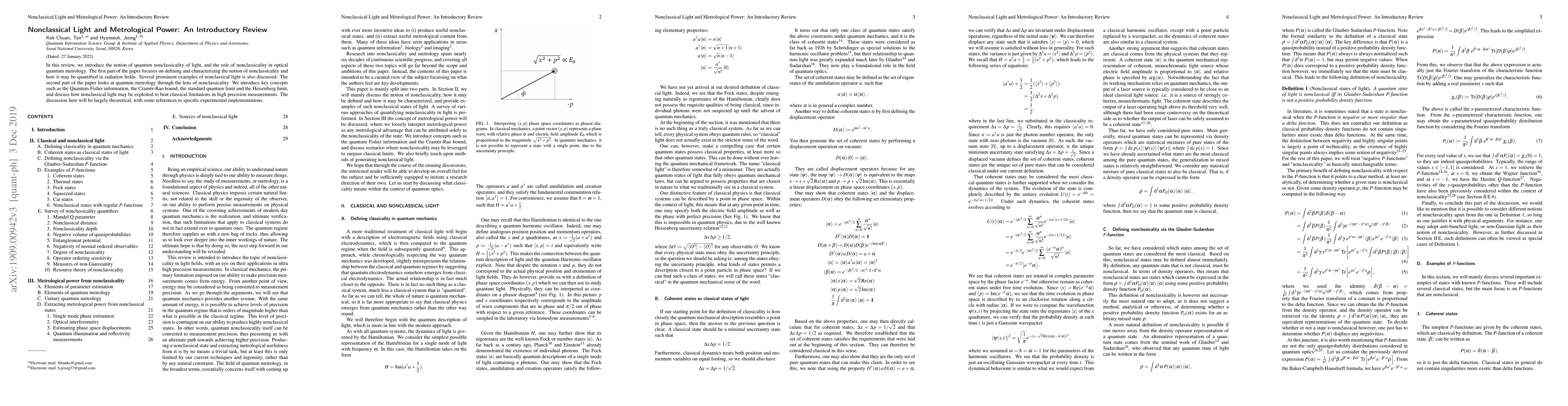 In this review, we introduce the notion of quantum nonclassicality of light, and the role of nonclassicality in optical quantum metrology. The first part of the paper focuses on defining and characterizing the notion of nonclassicality and how it may be quantified in radiation fields. Several prominent examples of nonclassical light is also discussed. The second part of the paper looks at quantum metrology through the lens of nonclassicality. We introduce key concepts such as the Quantum Fisher information, the Cram{\'e}r-Rao bound, the standard quantum limit and the Heisenberg limit, and discuss how nonclassical light may be exploited to beat classical limitations in high precision measurements. The discussion here will be largely theoretical, with some references to specific experimental implementations.