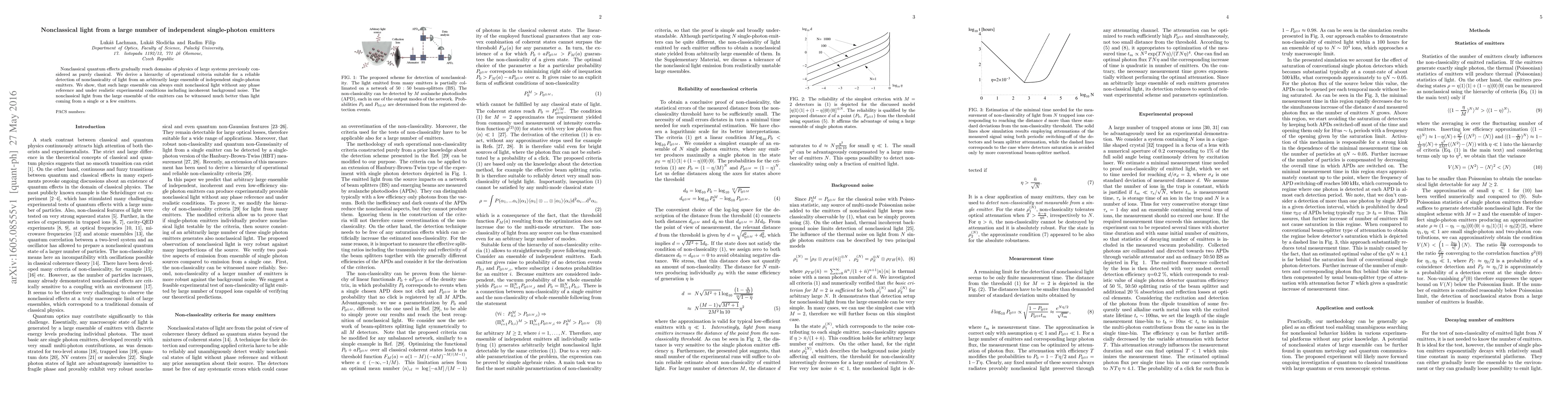 This paper develops criteria for detecting nonclassical quantum effects in light from large ensembles of independent single-photon emitters, demonstrating that such ensembles can emit nonclassical light without phase reference and under realistic experimental conditions, outperforming single or few emitters.