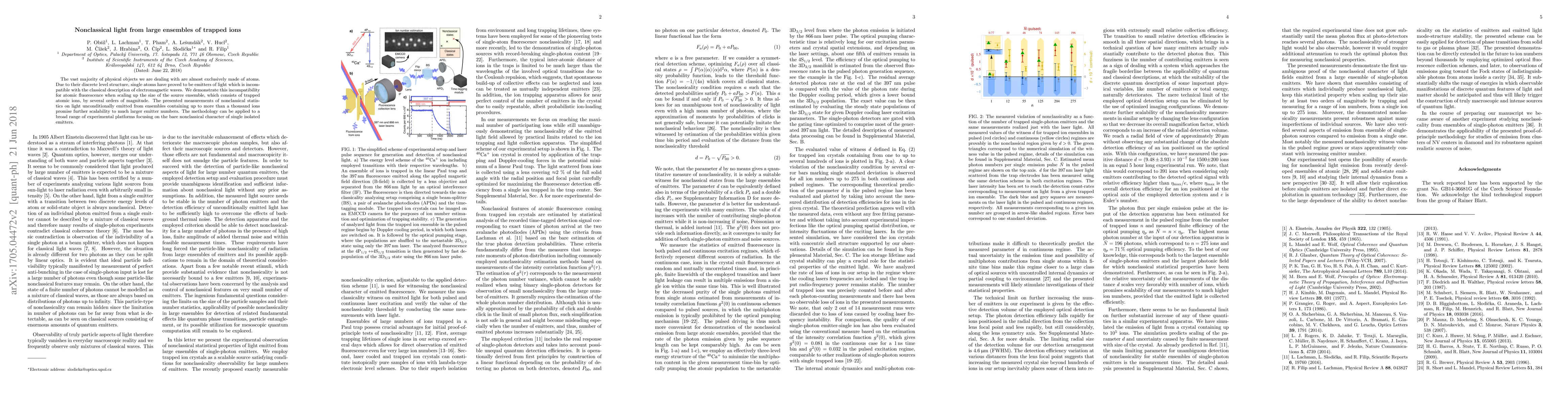 This paper demonstrates the emission of nonclassical light from a large ensemble of trapped atomic ions, showing that as the number of ions increases, the light emitted exhibits nonclassical statistics incompatible with classical electromagnetic wave descriptions. The scalable methodology promises further expansion to even larger emitter numbers.