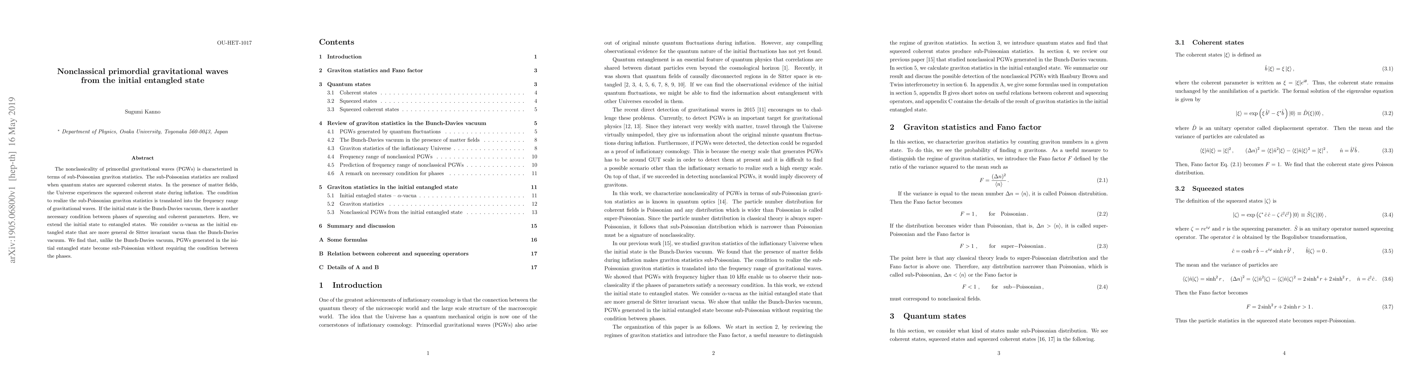 The nonclassicality of primordial gravitational waves (PGWs) is characterized in terms of sub-Poissonian graviton statistics. The sub-Poissonian statistics are realized when quantum states are squeezed coherent states. In the presence of matter fields, the Universe experiences the squeezed coherent state during inflation. The condition to realize the sub-Poissonian graviton statistics is translated into the frequency range of gravitational waves. If the initial state is the Bunch-Davies vacuum, there is another necessary condition between phases of squeezing and coherent parameters. Here, we extend the initial state to entangled states. We consider $\alpha$-vacua as the initial entangled state that are more general de Sitter invariant vacua than the Bunch-Davies vacuum. We find that, unlike the Bunch-Davies vacuum, PGWs generated in the initial entangled state become sub-Poissonian without requiring the condition between the phases.