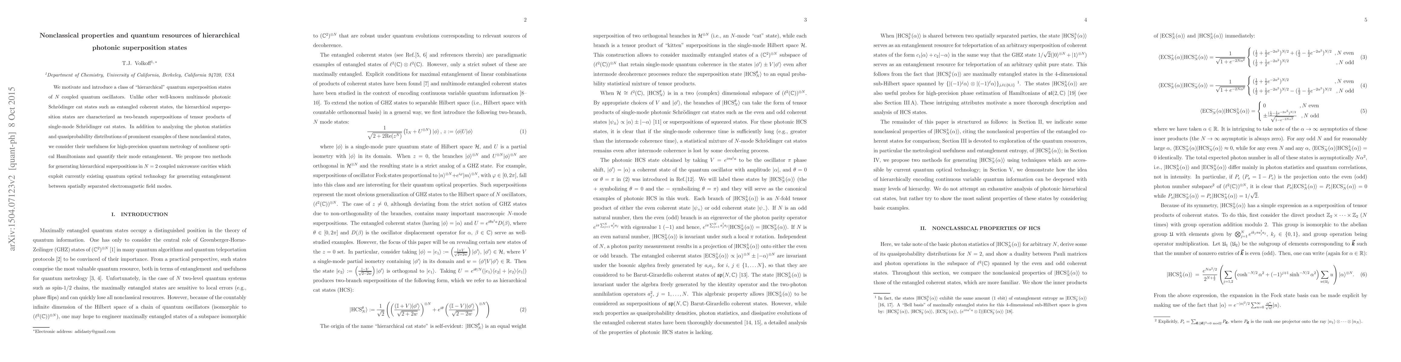 We motivate and introduce a class of "hierarchical" quantum superposition states of $N$ coupled quantum oscillators. Unlike other well-known multimode photonic Schr\"{o}dinger cat states such as entangled coherent states, the hierarchical superposition states are characterized as two-branch superpositions of tensor products of single-mode Schr\"{o}dinger cat states. In addition to analyzing the photon statistics and quasiprobability distributions of prominent examples of these nonclassical states, we consider their usefulness for high-precision quantum metrology of nonlinear optical Hamiltonians and quantify their mode entanglement. We propose two methods for generating hierarchical superpositions in $N=2$ coupled microwave cavities which exploit currently existing quantum optical technology for generating entanglement between spatially separated electromagnetic field modes.