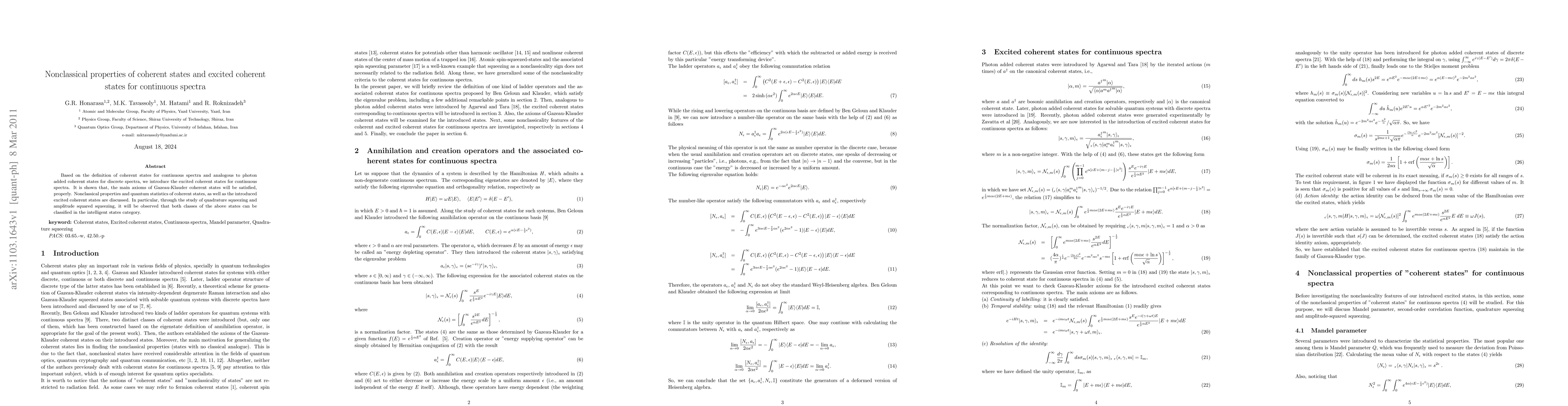 This paper introduces excited coherent states for continuous spectra, analogous to photon-added coherent states for discrete spectra, and demonstrates that they satisfy the main axioms of Gazeau-Klauder coherent states. The study explores nonclassical properties and quantum statistics, revealing that both coherent and excited coherent states exhibit quadrature squeezing and amplitude squared squeezing, categorizing them as intelligent states.