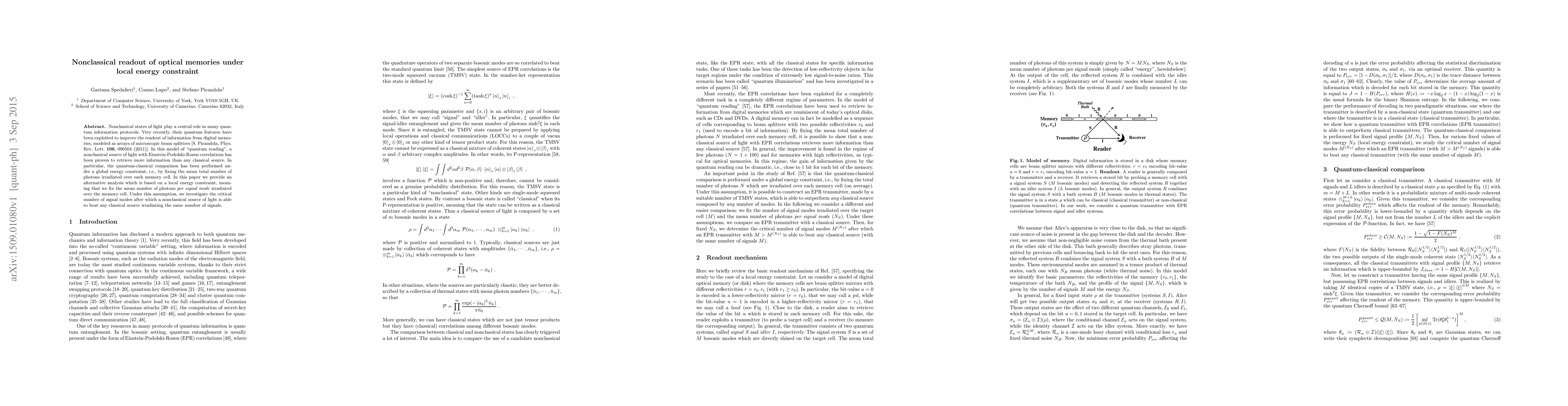 Researchers investigated how to read information from optical memories with limited energy under a local constraint. They found that a nonclassical source of light can outperform classical sources if it uses a sufficient number of signal modes.