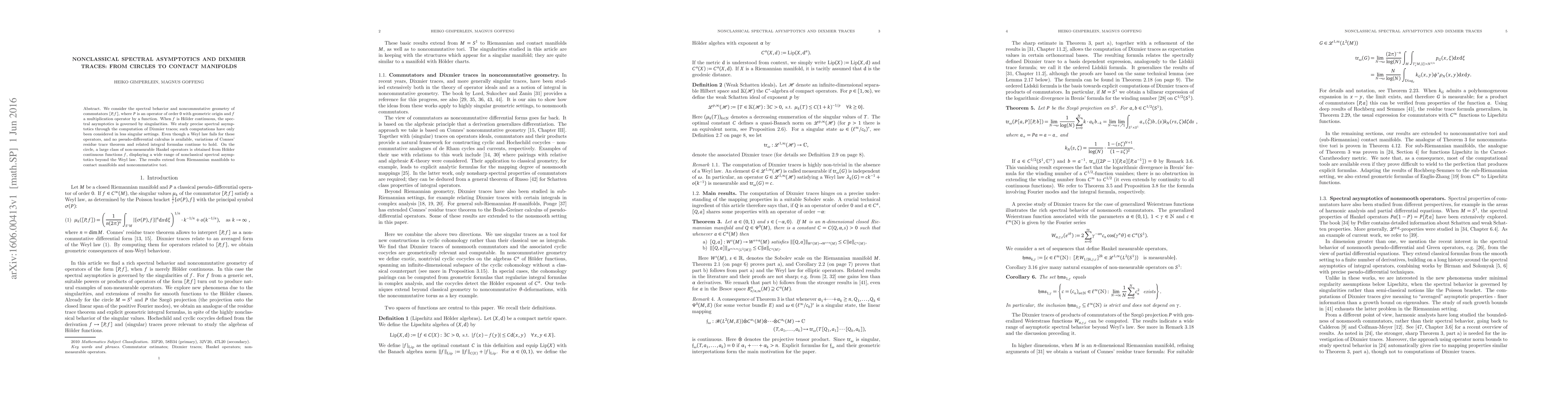 We consider the spectral behavior and noncommutative geometry of commutators $[P,f]$, where $P$ is an operator of order $0$ with geometric origin and $f$ a multiplication operator by a function. When $f$ is H\"{o}lder continuous, the spectral asymptotics is governed by singularities. We study precise spectral asymptotics through the computation of Dixmier traces; such computations have only been considered in less singular settings. Even though a Weyl law fails for these operators, and no pseudo-differential calculus is available, variations of Connes' residue trace theorem and related integral formulas continue to hold. On the circle, a large class of non-measurable Hankel operators is obtained from H\"older continuous functions $f$, displaying a wide range of nonclassical spectral asymptotics beyond the Weyl law. The results extend from Riemannian manifolds to contact manifolds and noncommutative tori.