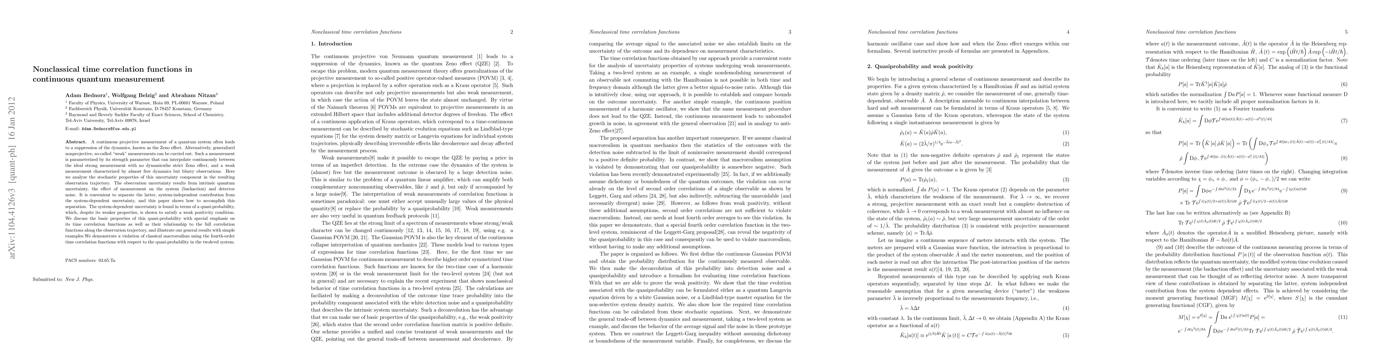A continuous projective measurement of a quantum system often leads to a suppression of the dynamics, known as the Zeno effect. Alternatively, generalized nonprojective, so-called "weak" measurements can be carried out. Such a measurement is parameterized by its strength parameter that can interpolate continuously between the ideal strong measurement with no dynamics-the strict Zeno effect, and a weak measurement characterized by almost free dynamics but blurry observations. Here we analyze the stochastic properties of this uncertainty component in the resulting observation trajectory. The observation uncertainty results from intrinsic quantum uncertainty, the effect of measurement on the system (backaction) and detector noise. It is convenient to separate the latter, system-independent contribution from the system-dependent uncertainty, and this paper shows how to accomplish this separation. The system-dependent uncertainty is found in terms of a quasi-probability, which, despite its weaker properties, is shown to satisfy a weak positivity condition. We discuss the basic properties of this quasi-probability with special emphasis on its time correlation functions as well as their relationship to the full correlation functions along the observation trajectory, and illustrate our general results with simple examples.We demonstrate a violation of classical macrorealism using the fourth-order time correlation functions with respect to the quasi-probability in the twolevel system.
