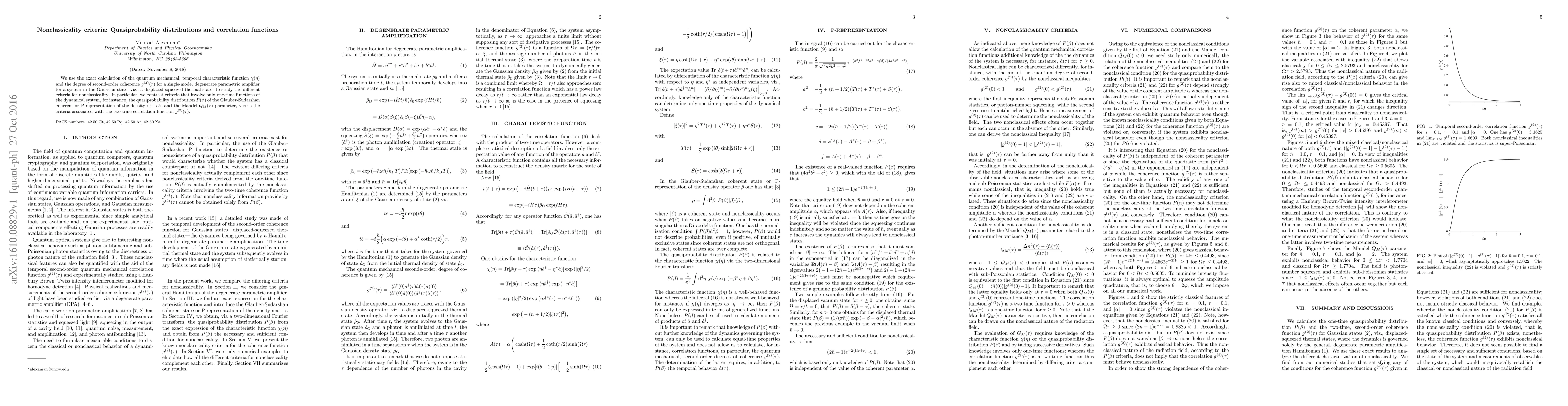 This paper investigates nonclassicality criteria in quantum systems using a single-mode degenerate parametric amplifier in a Gaussian state. It contrasts one-time criteria like the Glauber-Sudarshan P-representation and the Mandel Q parameter against two-time criteria involving the second-order coherence function $g^{(2)}(\tau)$.