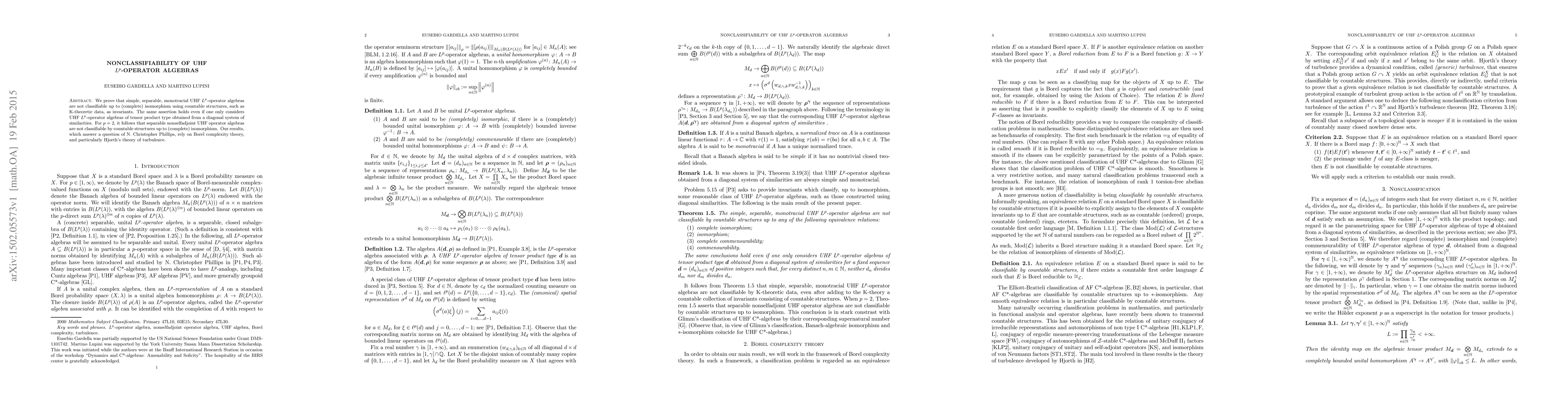 This paper demonstrates that simple, separable, monotracial UHF $L^p$ operator algebras cannot be classified using countable invariants like K-theoretic data. The findings apply to both general UHF $L^p$ algebras and those derived from diagonal systems, with significant implications for $p=2$ nonselfadjoint UHF operator algebras. The results rely on Borel complexity theory, specifically Hjorth's turbulence theory.