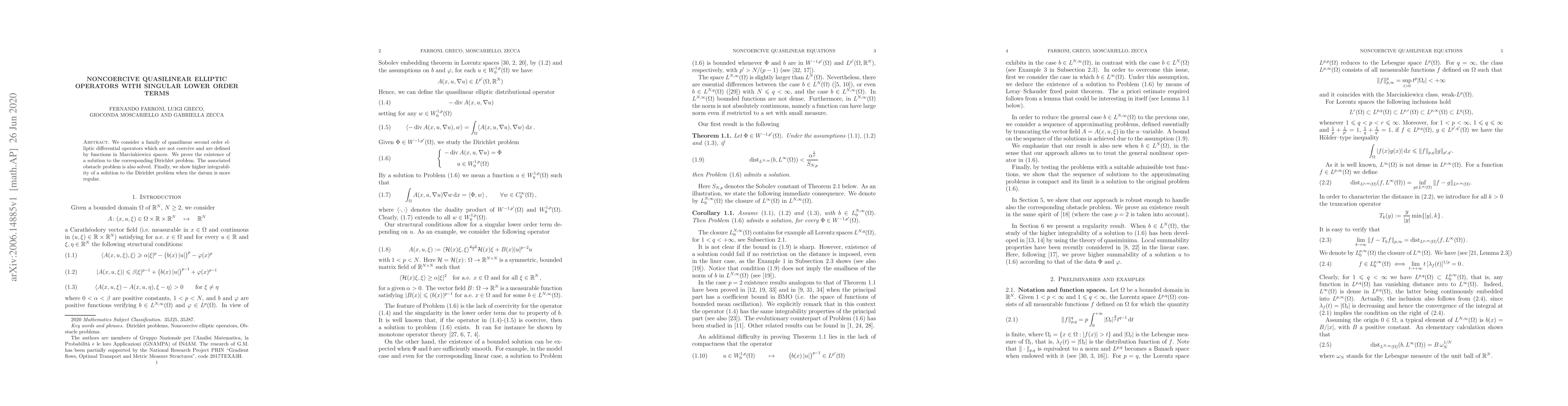 We consider a family of quasilinear second order elliptic differential operators which are not coercive and are defined by functions in Marcinkiewicz spaces. We prove the existence of a solution to the corresponding Dirichlet problem. The associated obstacle problem is also solved. Finally, we show higher integrability of a solution to the Dirichlet problem when the datum is more regular.
