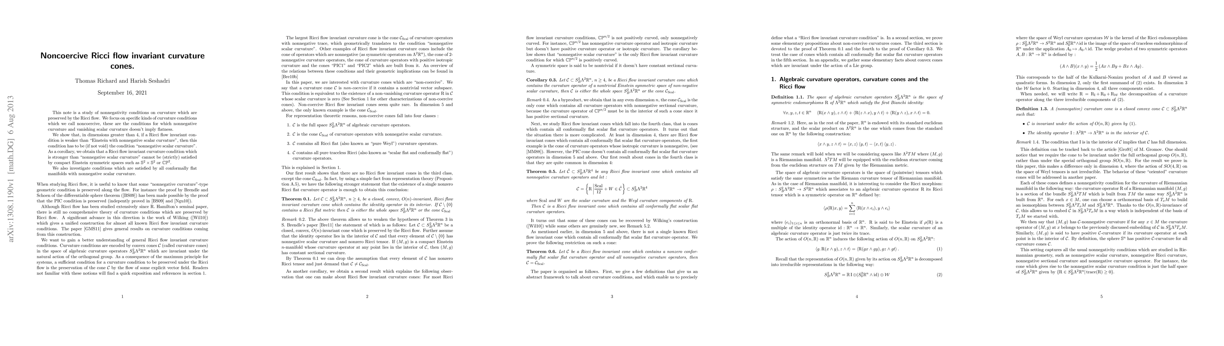 This paper examines curvature conditions preserved by Ricci flow, specifically noncoercive conditions that allow nonnegative curvature and vanishing scalar curvature without implying flatness. It finds that in dimensions greater than 4, any Ricci flow invariant condition weaker than "Einstein with nonnegative scalar curvature" must be "nonnegative scalar curvature".
