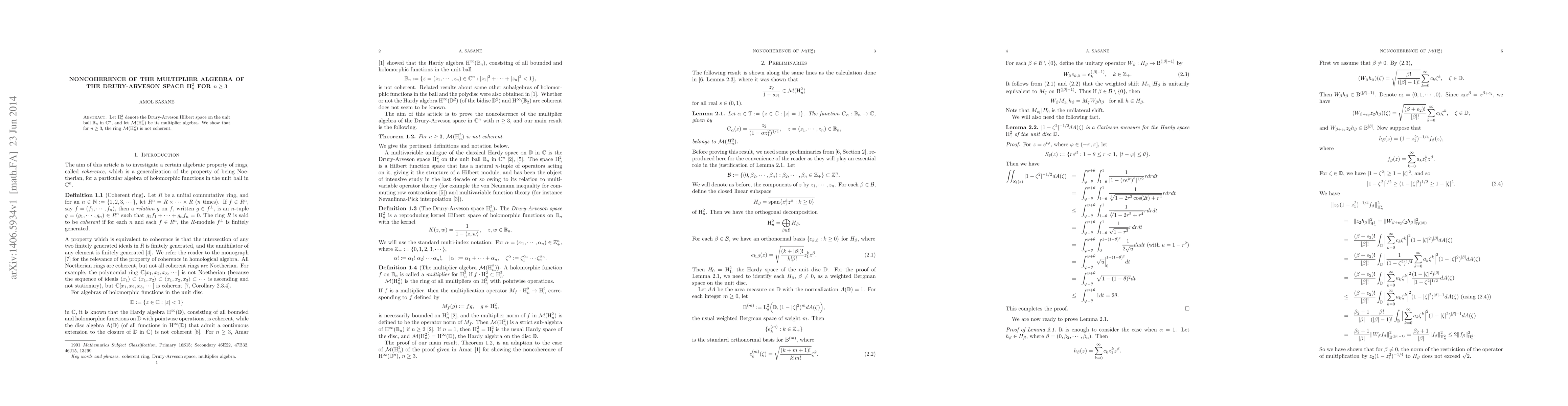 Let H_n^2 denote the Drury-Arveson Hilbert space on the unit ball B_n in C^n, and let M(H_n^2) be its multiplier algebra. We show that for n>=3, the ring M(H_n^2) is not coherent.