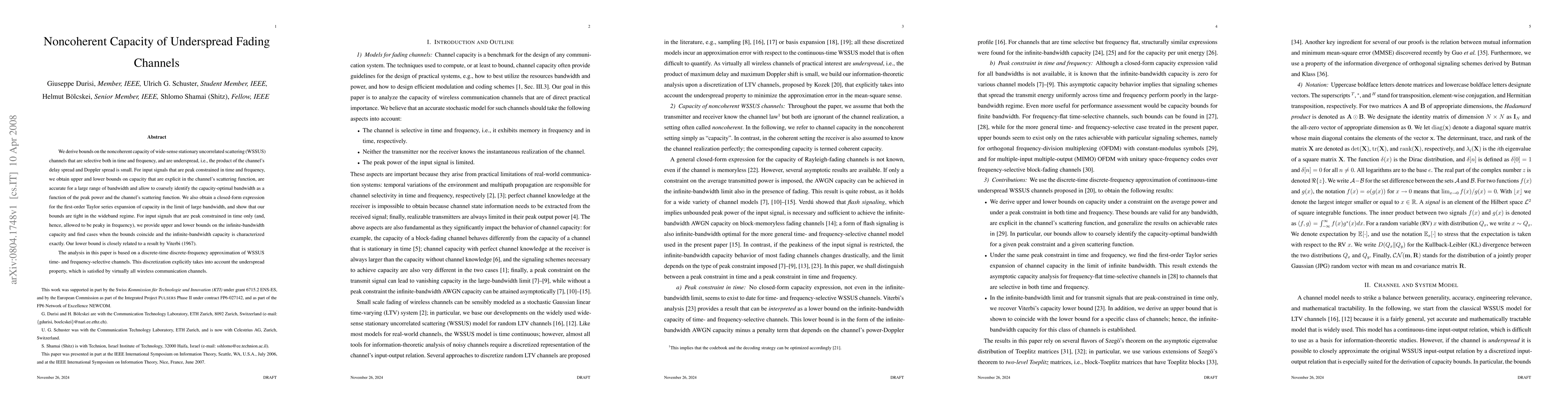 This paper derives bounds on the noncoherent capacity of underspread fading channels, focusing on wide-sense stationary uncorrelated scattering channels that are selective in both time and frequency. The authors provide explicit bounds on capacity that are accurate over a wide range of bandwidths and identify optimal bandwidths based on peak power and scattering function.