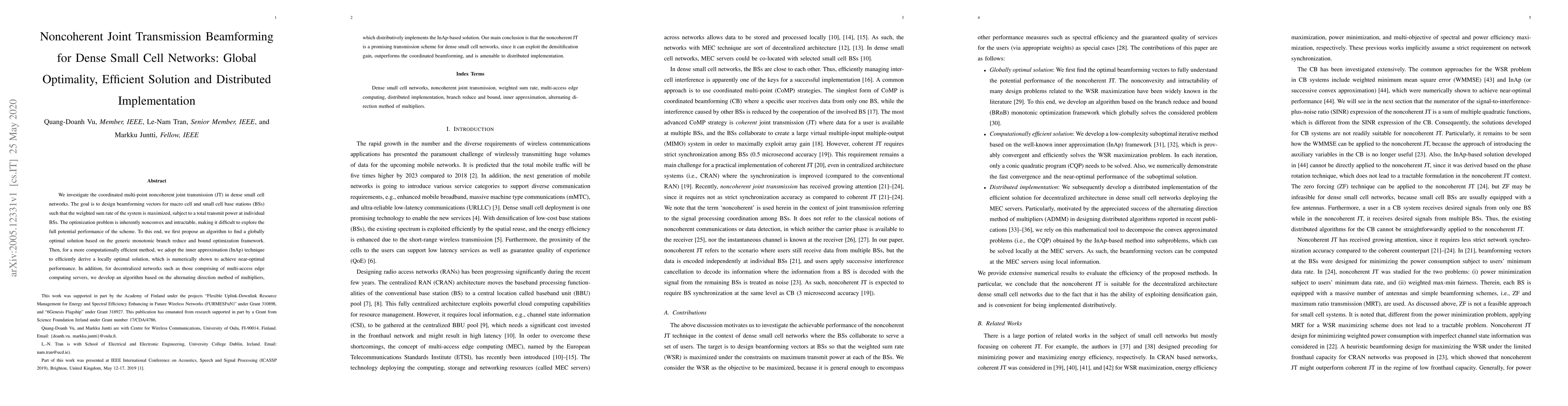 We investigate the coordinated multi-point noncoherent joint transmission (JT) in dense small cell networks. The goal is to design beamforming vectors for macro cell and small cell base stations (BSs) such that the weighted sum rate of the system is maximized, subject to a total transmit power at individual BSs. The optimization problem is inherently nonconvex and intractable, making it difficult to explore the full potential performance of the scheme. To this end, we first propose an algorithm to find a globally optimal solution based on the generic monotonic branch reduce and bound optimization framework. Then, for a more computationally efficient method, we adopt the inner approximation (InAp) technique to efficiently derive a locally optimal solution, which is numerically shown to achieve near-optimal performance. In addition, for decentralized networks such as those comprising of multi-access edge computing servers, we develop an algorithm based on the alternating direction method of multipliers, which distributively implements the InAp-based solution. Our main conclusion is that the noncoherent JT is a promising transmission scheme for dense small cell networks, since it can exploit the densitification gain, outperforms the coordinated beamforming, and is amenable to distributed implementation.