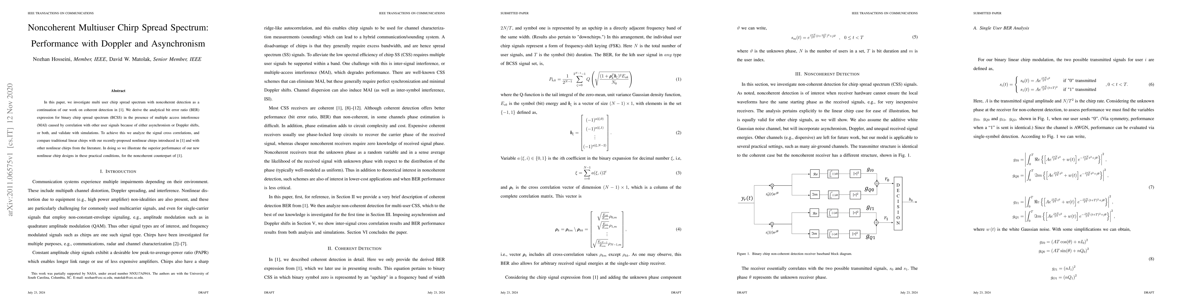 Researchers investigated noncoherent multiuser chirp spread spectrum with performance analysis in the presence of Doppler shifts and asynchronism, showing improved performance of their nonlinear chirp designs.
